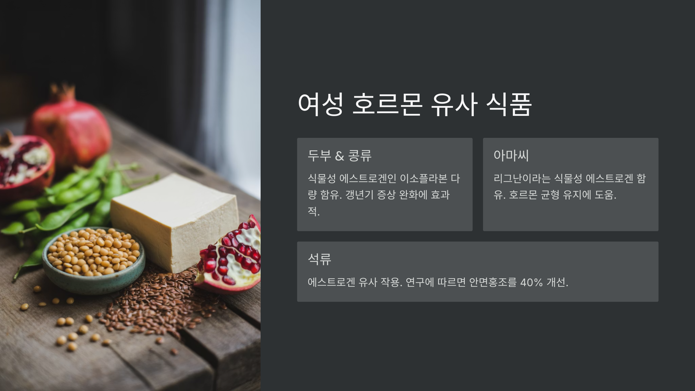 이런 식품들을 꾸준히 섭취하면 안면홍조, 식은땀, 불면증 같은 증상이 완화되고, 갱년기 이후 골다공증 예방에도 긍정적인 영향을 줄 수 있어요.