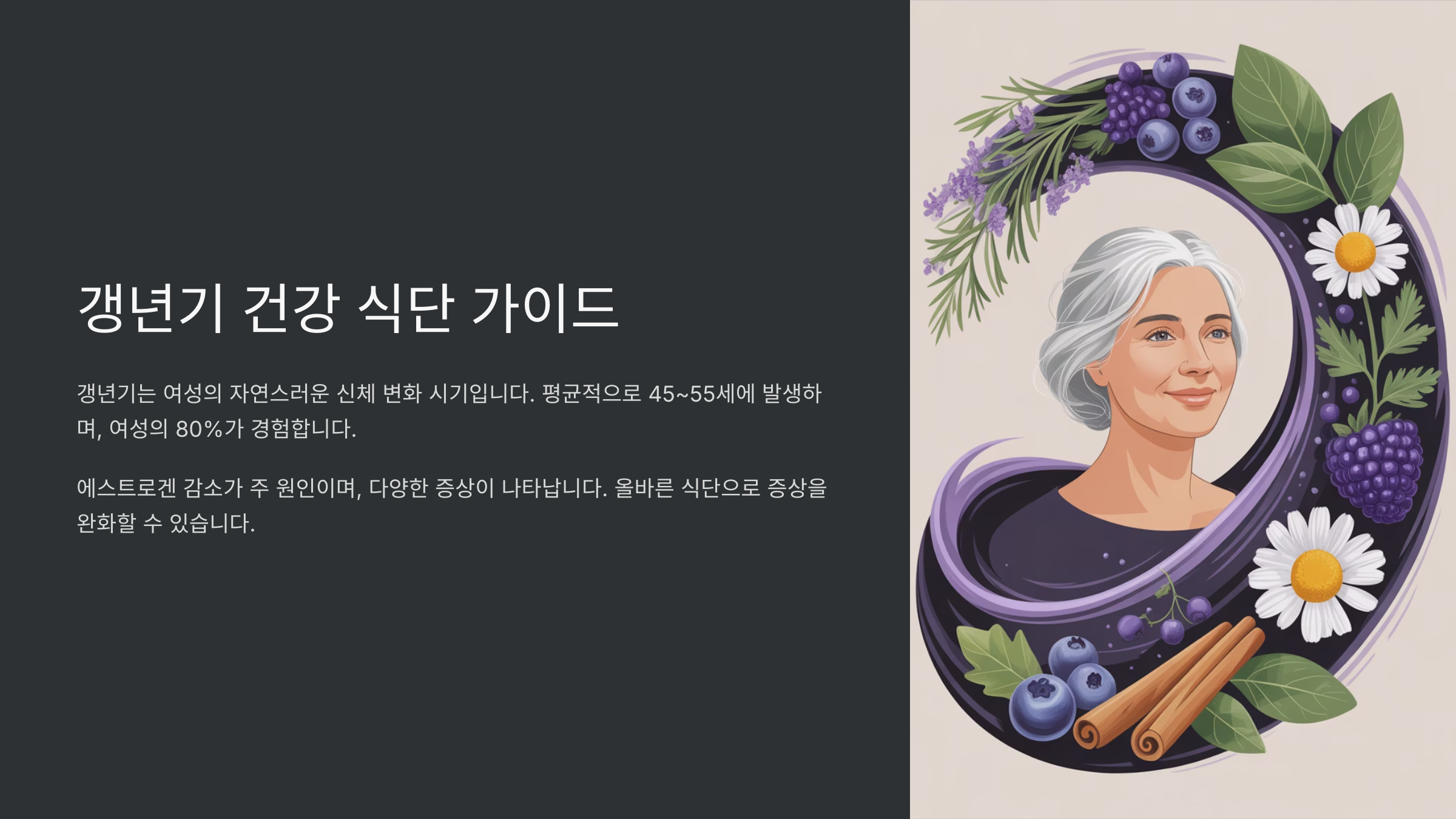 내가 생각했을 때 갱년기는 '건강한 전환기'로 받아들이면 마음이 훨씬 편해져요. 불편함을 줄이고 활력 있게 보내려면, 식탁 위부터 바꿔보는 걸 추천해요. 🌷