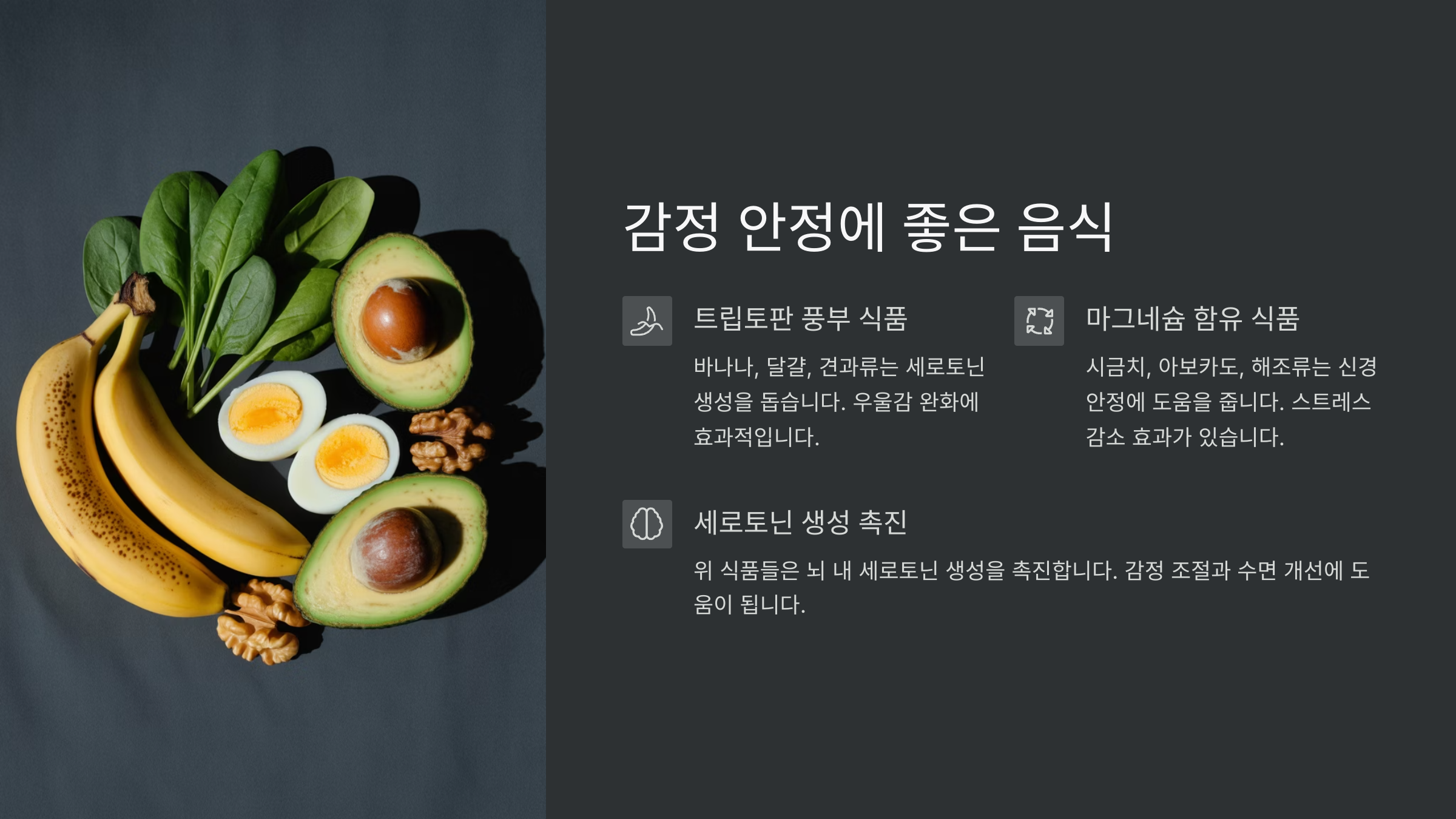 이럴 때는 뇌 신경전달물질에 작용하는 음식들을 통해 감정을 부드럽게 다스릴 수 있어요. 특히 세로토닌을 증가시키는 음식이 중요해요. 세로토닌은 '행복 호르몬'이라고 불리며 안정감과 긍정적인 기분을 유지시켜줘요.