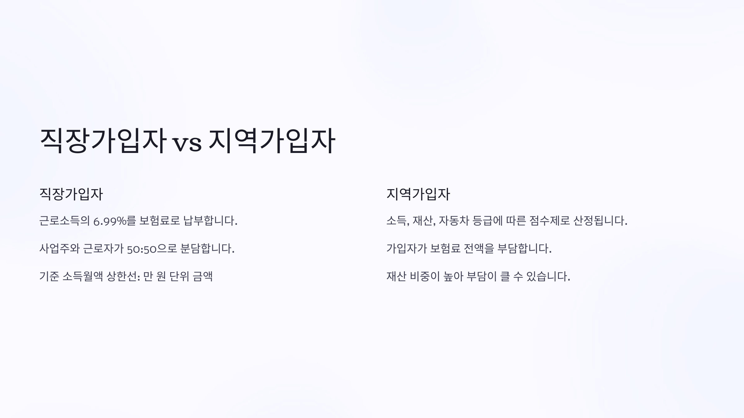 건강보험료의 계산은 가입 유형에 따라 크게 달라져요. 바로 ‘직장가입자’와 ‘지역가입자’인데요, 이 둘은 산정 방식부터 항목까지 완전히 달라요! ⚖️