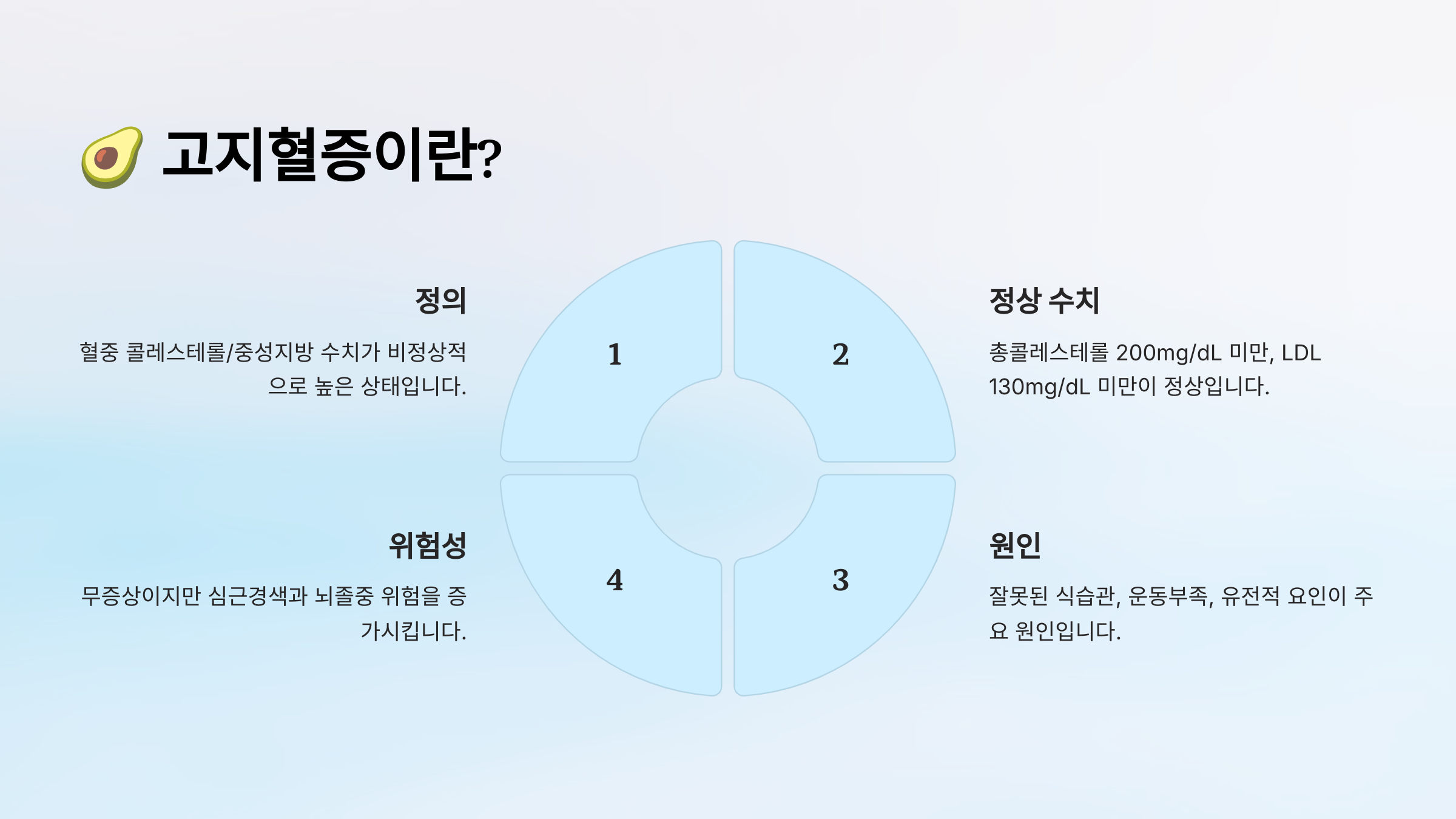 고지혈증은 혈액 속의 지방 성분이 비정상적으로 높은 상태를 말해요. 특히 중성지방과 LDL 콜레스테롤이 증가하면 심혈관 질환 위험이 커진답니다.
