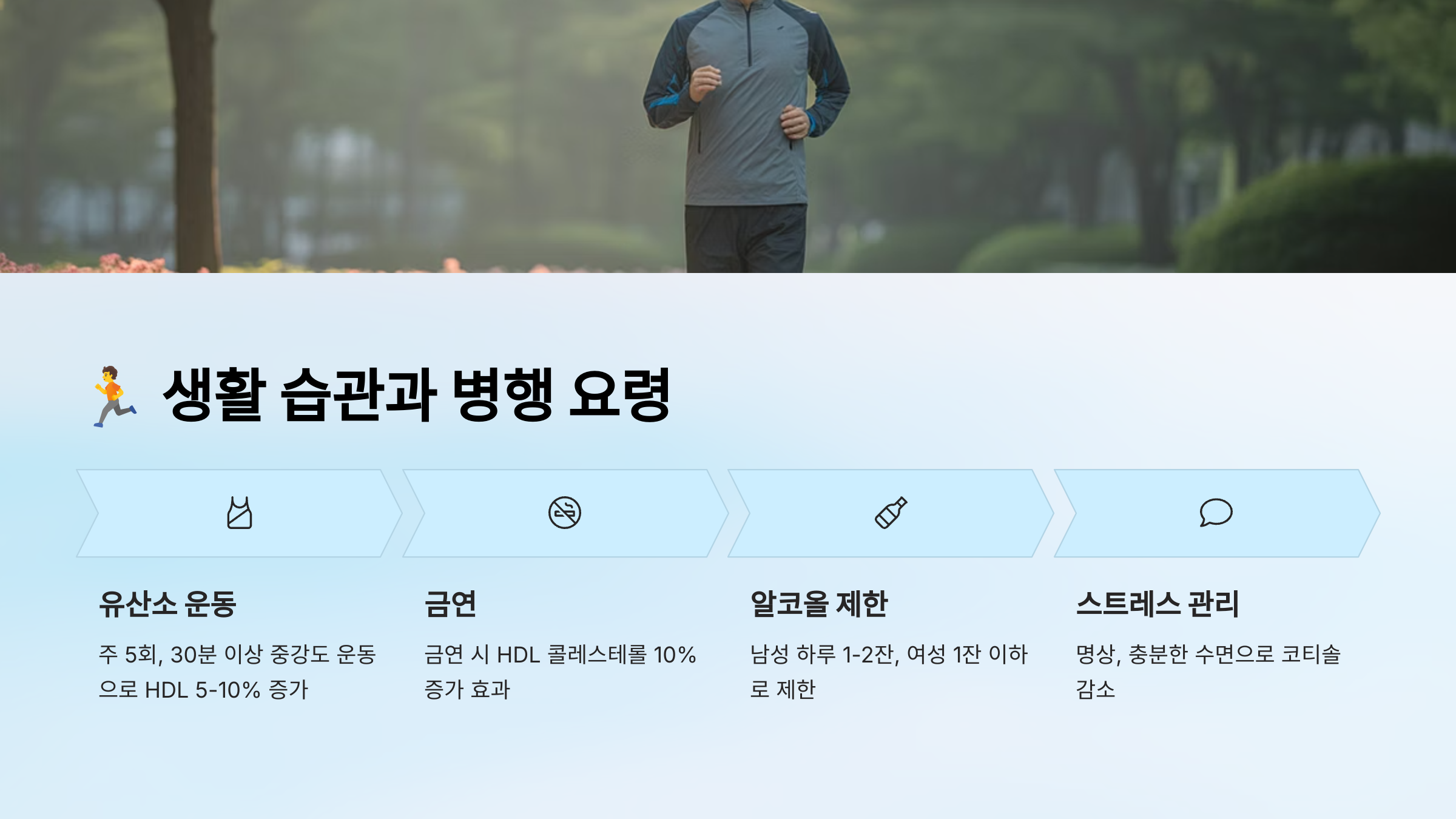 가장 먼저 실천해야 할 건 **규칙적인 운동**이에요. 유산소 운동은 HDL을 높이고 LDL과 중성지방을 줄이는 데 직접적인 효과가 있어요. 걷기, 자전거, 수영, 줄넘기 모두 좋아요.