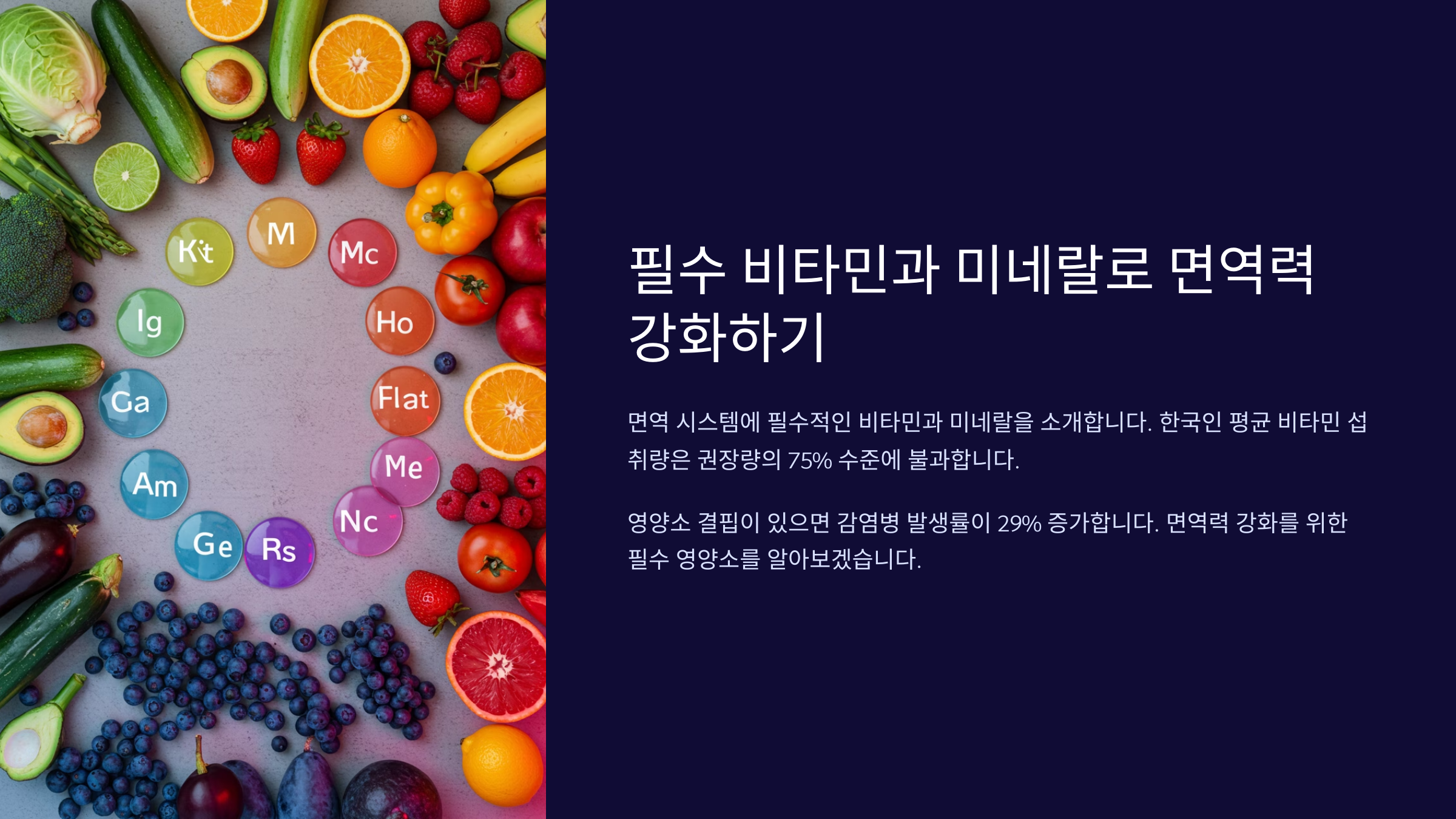 그중에서도 비타민C, D, A, E, 아연은 면역 세포를 활성화하고 염증을 조절하는 중요한 역할을 해요. 이 영양소들은 면역 밸런스를 유지하고 외부 병원체로부터 우리 몸을 지켜주는 역할을 해요.