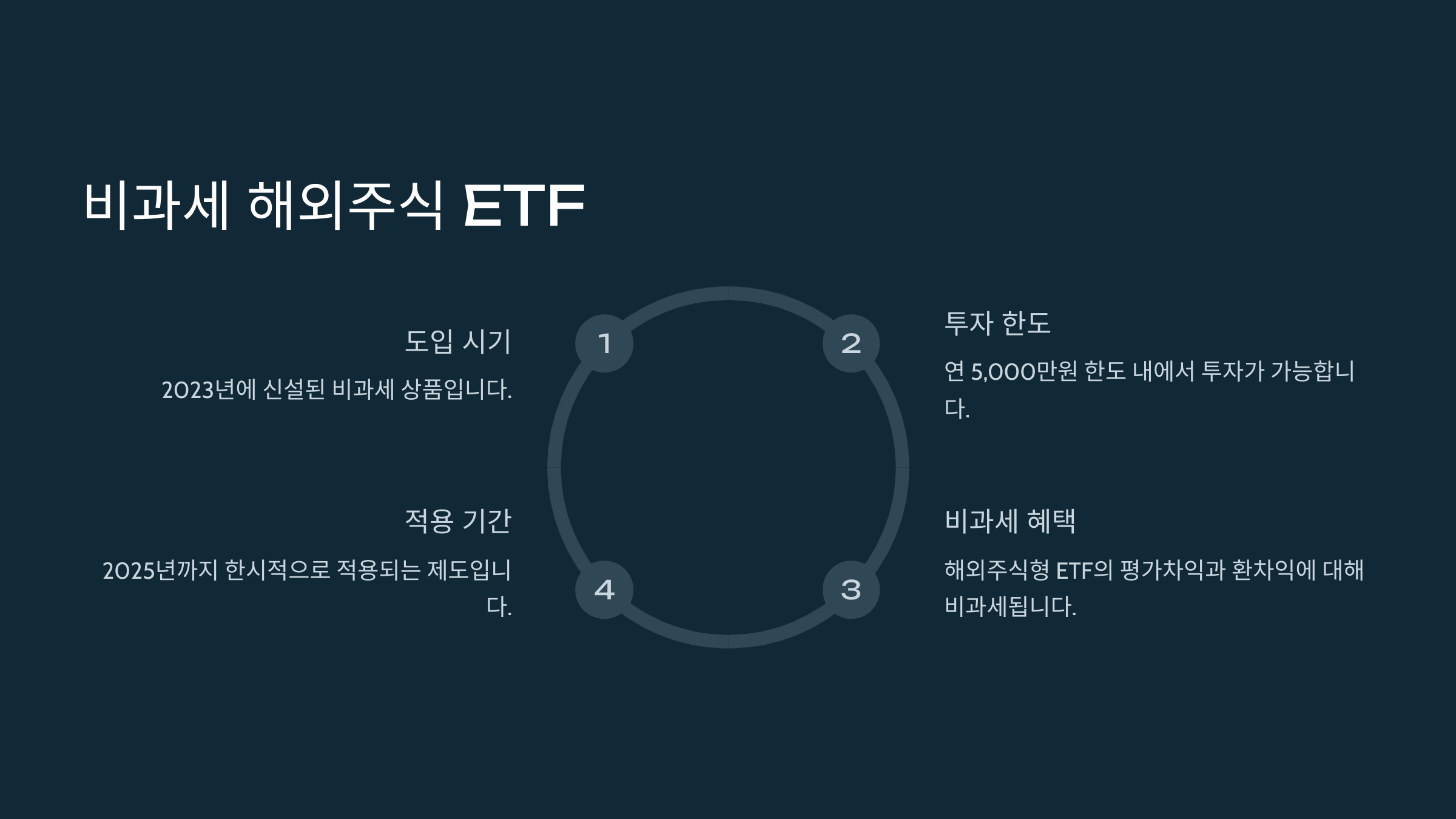 2025년까지 한시적으로 적용되는 이 제도는, 연간 최대 5,000만 원까지 해외주식형 ETF에 투자해서 얻은 수익에 대해 비과세 혜택을 줘요. 단, 국내 상장된 해외주식 ETF에만 해당된다는 점을 꼭 기억하세요!