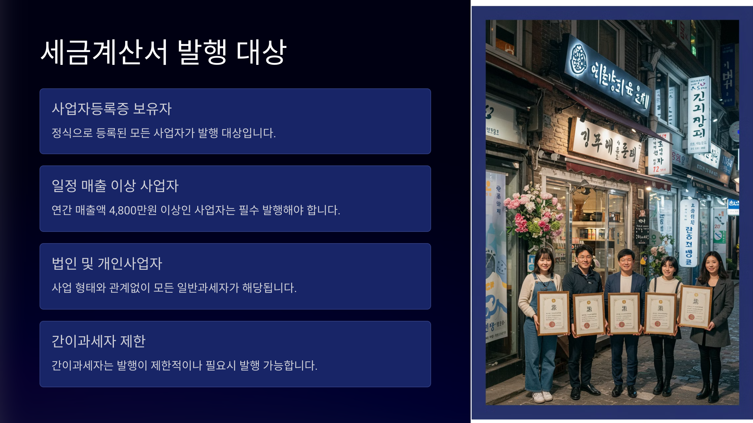 세금계산서는 모든 사업자가 발행할 수 있는 건 아니에요. 부가가치세 일반과세자로 등록된 개인사업자 또는 법인사업자만 발행 가능해요. 간이과세자는 세금계산서 대신 ‘계산서’만 발급할 수 있어요.