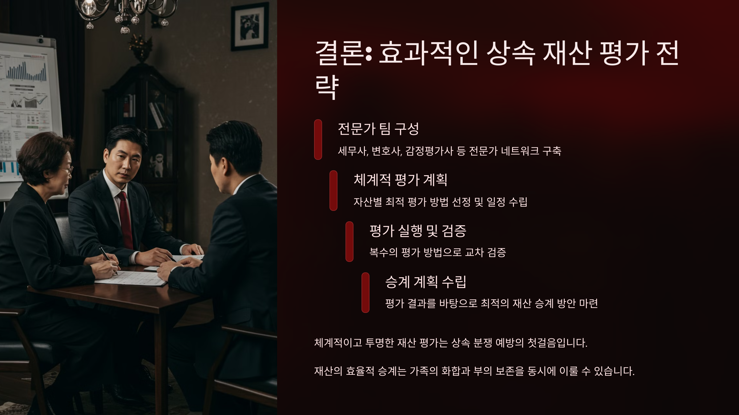 이런 경우 상속인끼리 합의 없이 평가액을 무시하고 지분만 나눠버리면 분쟁이 발생할 수 있어요. 그래서 기업 자산의 경우는 반드시 전문가의 조력을 받는 게 좋아요.