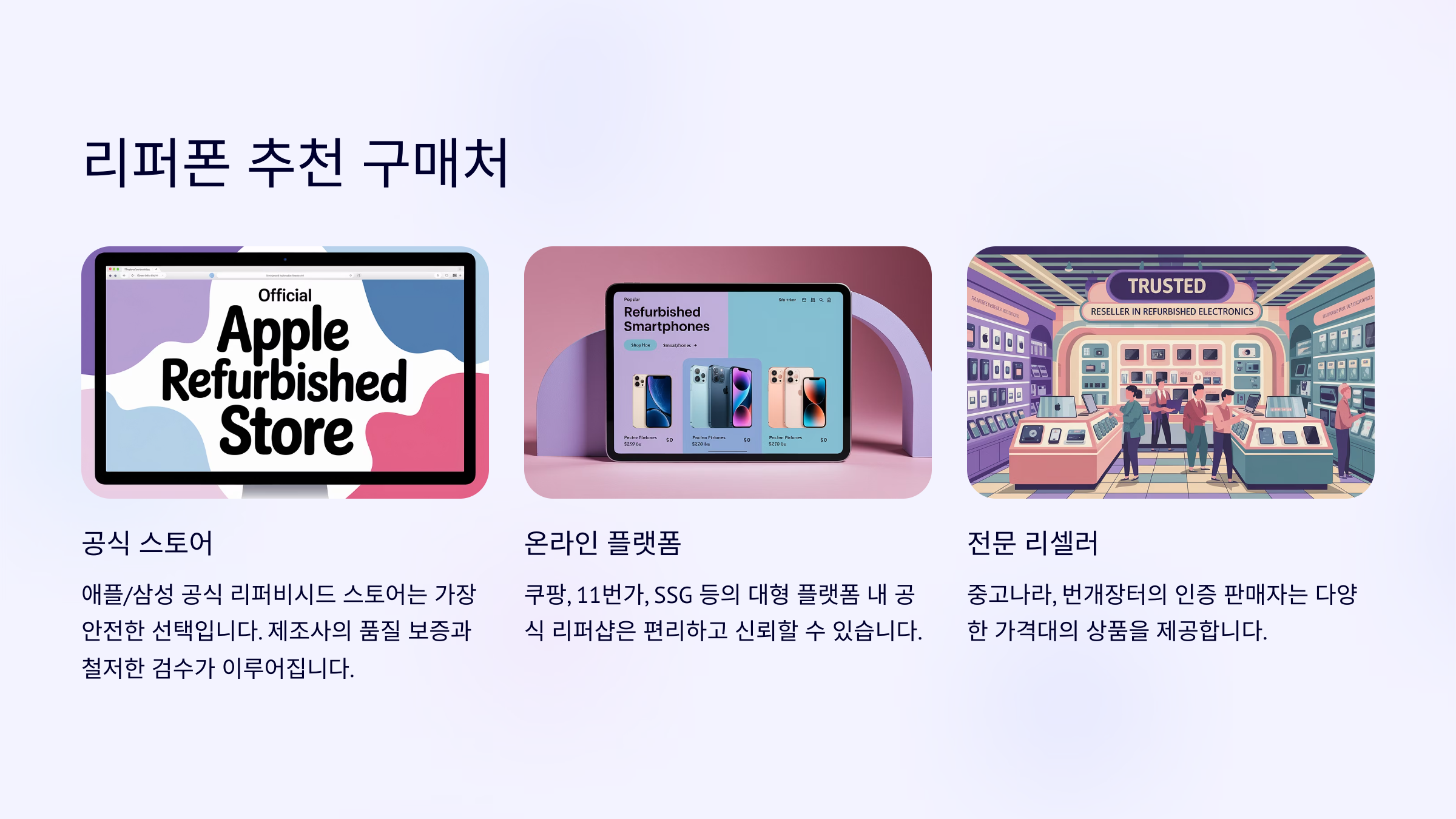 리퍼폰은 어디서 사느냐가 정말 중요해요! 믿을 수 있는 판매처를 고르는 게 절대 조건이에요. 🛡️