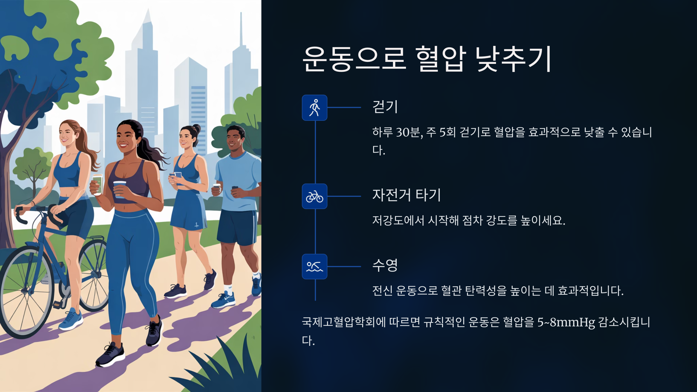 하루 30분, 주 5일 이상의 유산소 운동은 수축기 혈압을 평균 5~10mmHg 정도 낮출 수 있다고 해요. 걷기 운동만으로도 효과를 보았다는 사례가 많기 때문에, 격렬하지 않아도 꾸준히만 하면 충분히 도움이 된답니다.