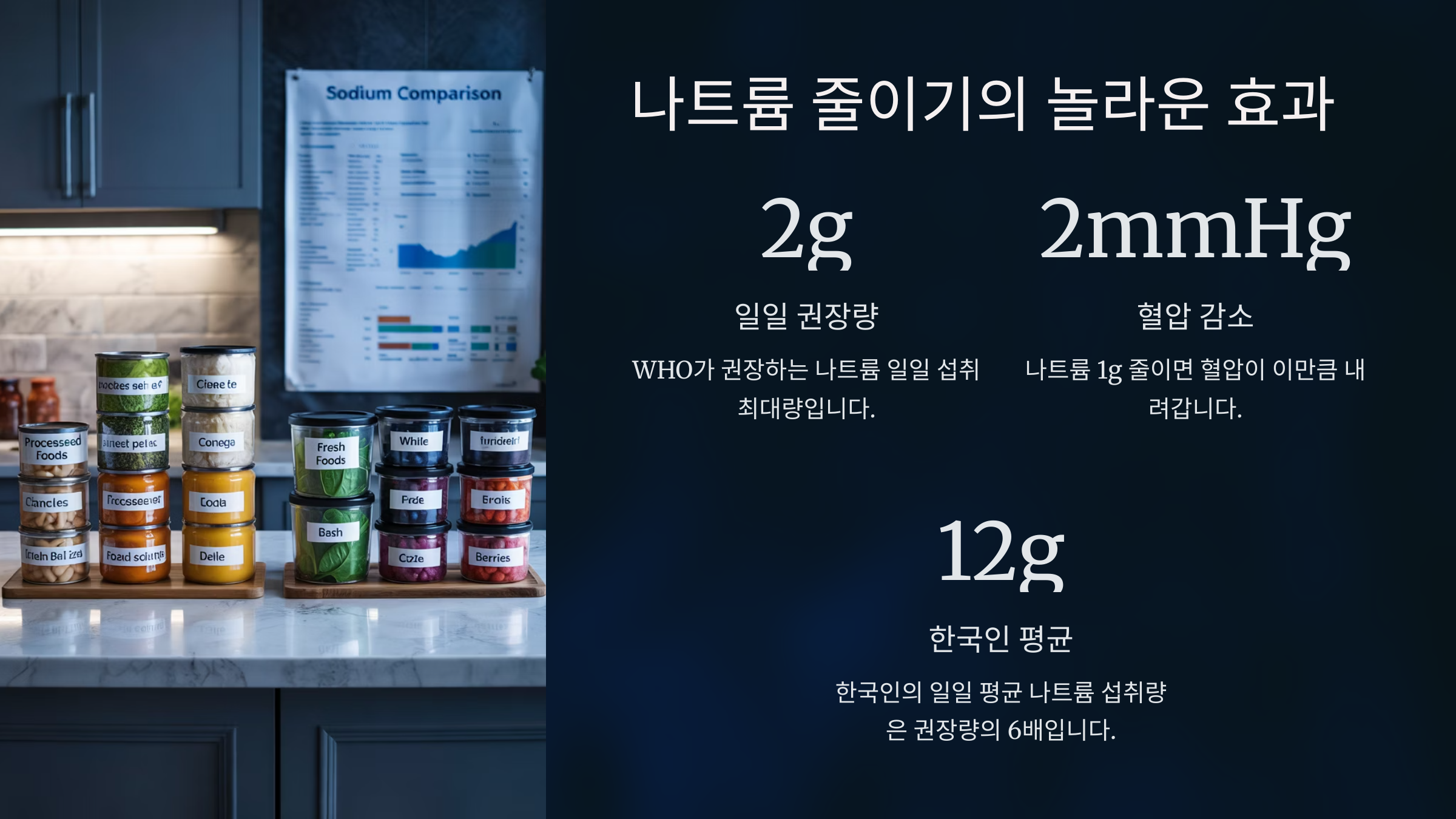 세계보건기구(WHO)는 하루 나트륨 권장량을 2g 이하(소금 5g 미만)로 정하고 있어요. 그런데 한국인의 평균 나트륨 섭취량은 이보다 2~3배 많은 수준이에요. 김치, 찌개, 라면, 간장 등 일상적인 음식 속에 너무 많이 들어 있거든요.