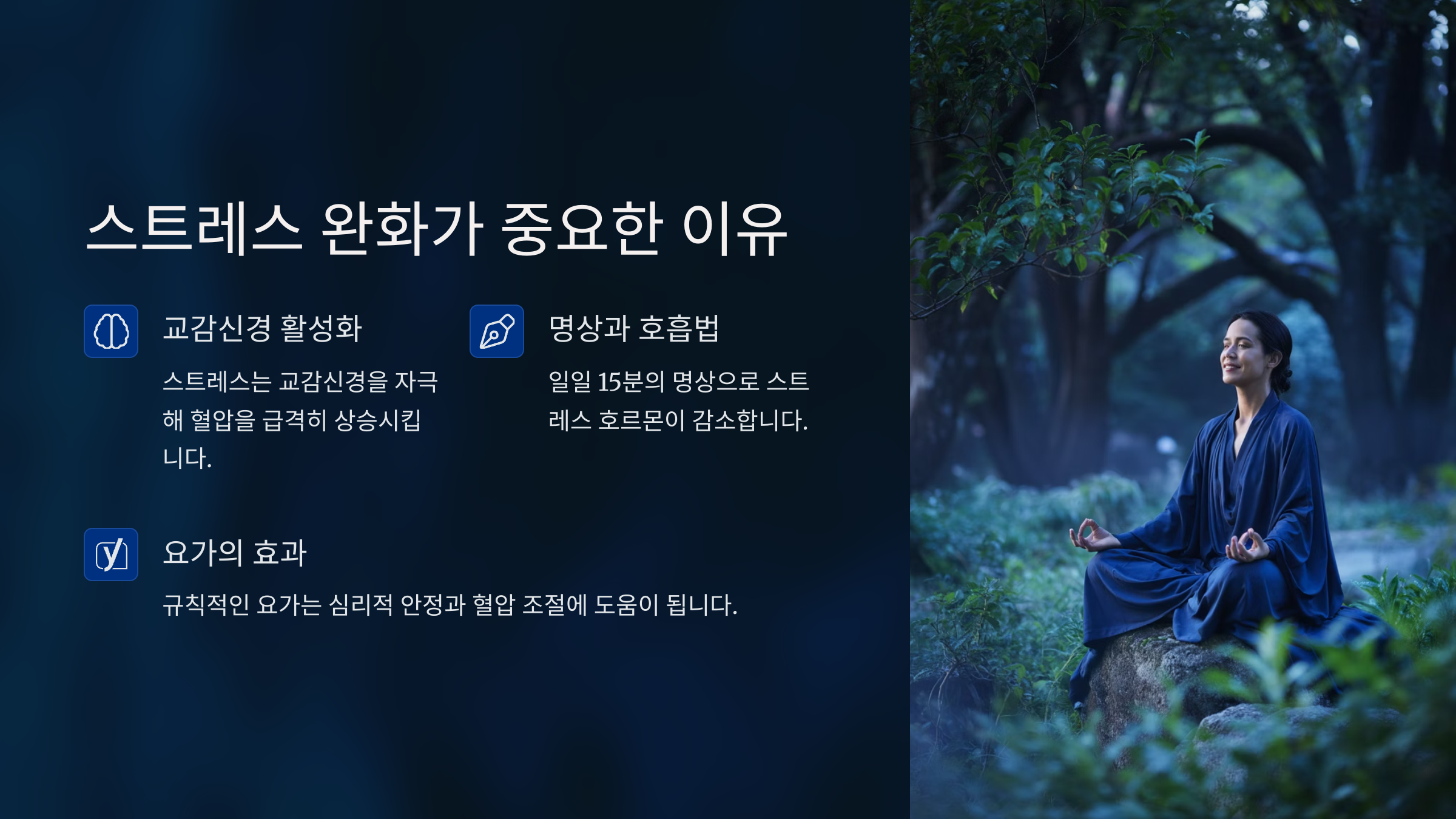 스트레스를 줄이기 위한 방법으로는 명상, 심호흡, 요가, 자연 산책이 좋아요. 최근 연구에 따르면, 하루 10분간의 명상만으로도 수축기 혈압이 평균 4~5mmHg 감소했다고 해요. 이렇게 간단한 습관 하나가 건강에 큰 영향을 주는 거죠.