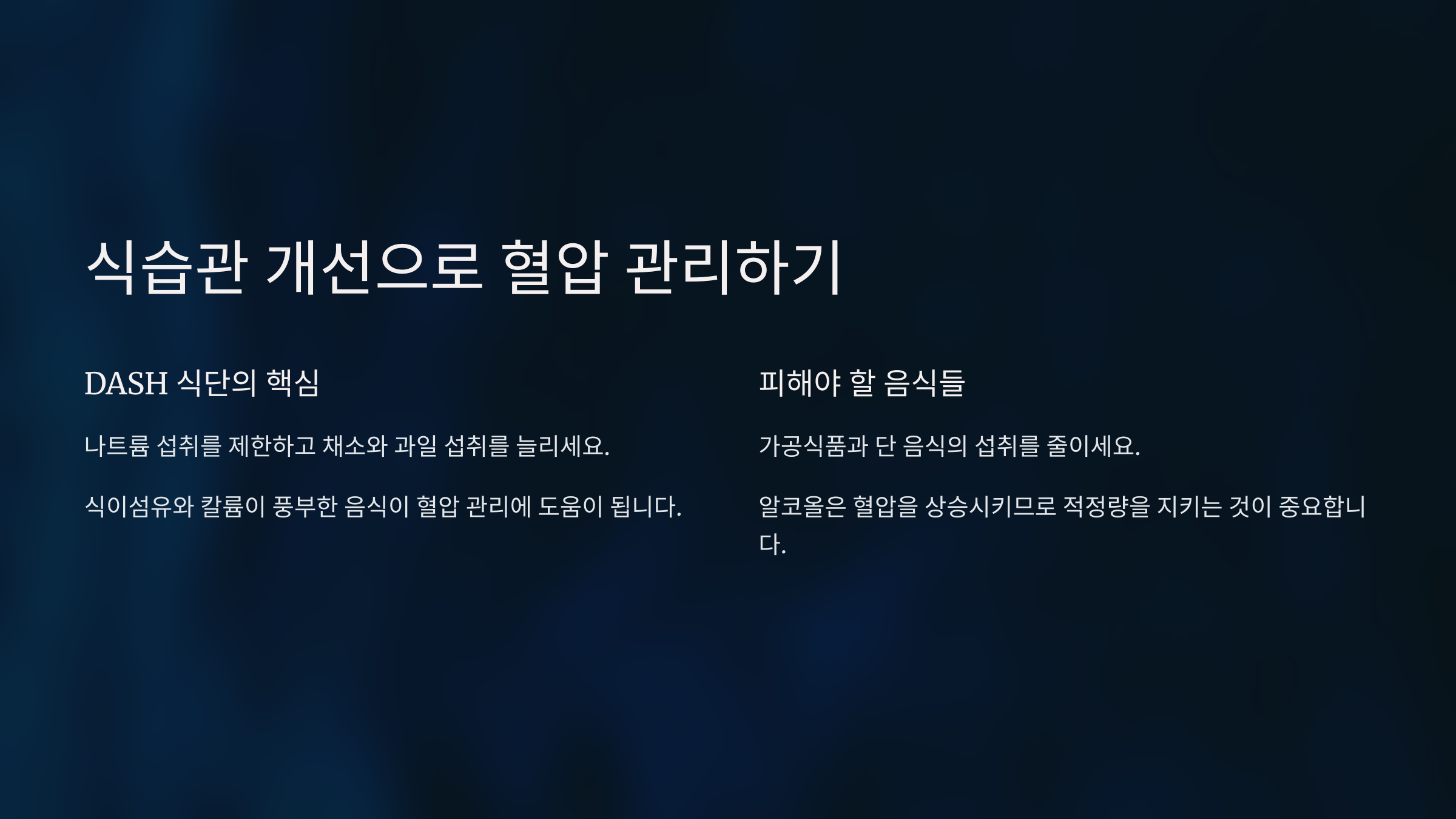 식단은 결국 습관이에요. 처음엔 어렵게 느껴질 수 있지만, 일주일만 바꿔봐도 몸이 훨씬 가볍고 혈압도 안정되는 걸 느낄 수 있어요.