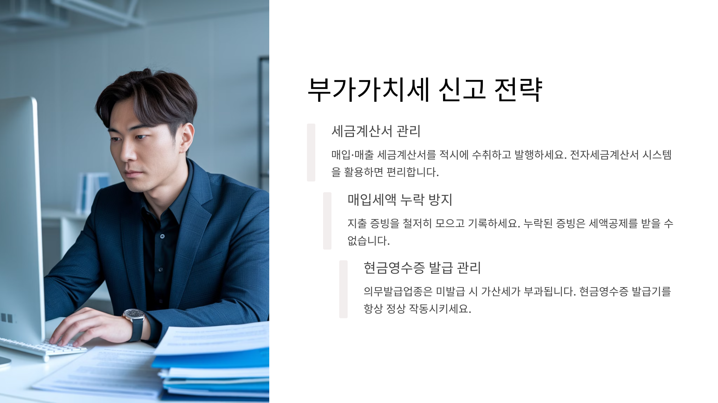 또한 반기마다 부가세 신고를 할 때는 매출자료와 매입자료를 정확하게 정리해 두는 것이 중요해요. 특히 매출 누락이나 매입 과다는 세무조사로 이어질 수 있으니 주의해야 해요.