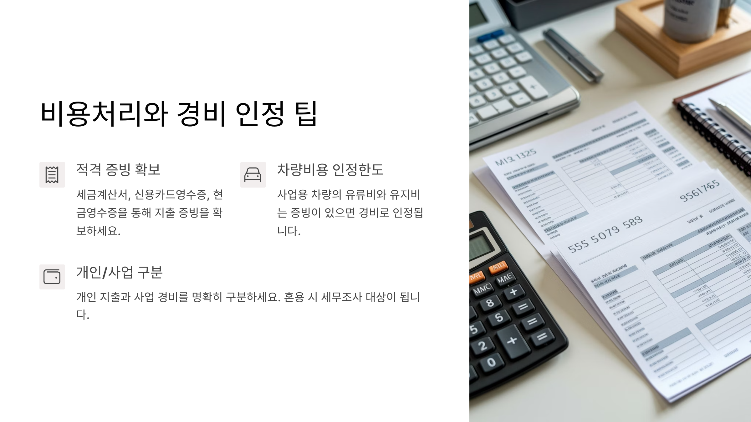 예를 들어 사무실 임대료, 전기세, 수도세, 인터넷 요금, 차량유지비, 통신비 등 업무와 관련된 지출은 대부분 비용처리가 가능해요. 이때 중요한 건 ‘증빙자료’예요. 현금영수증, 카드내역, 세금계산서가 필수랍니다.