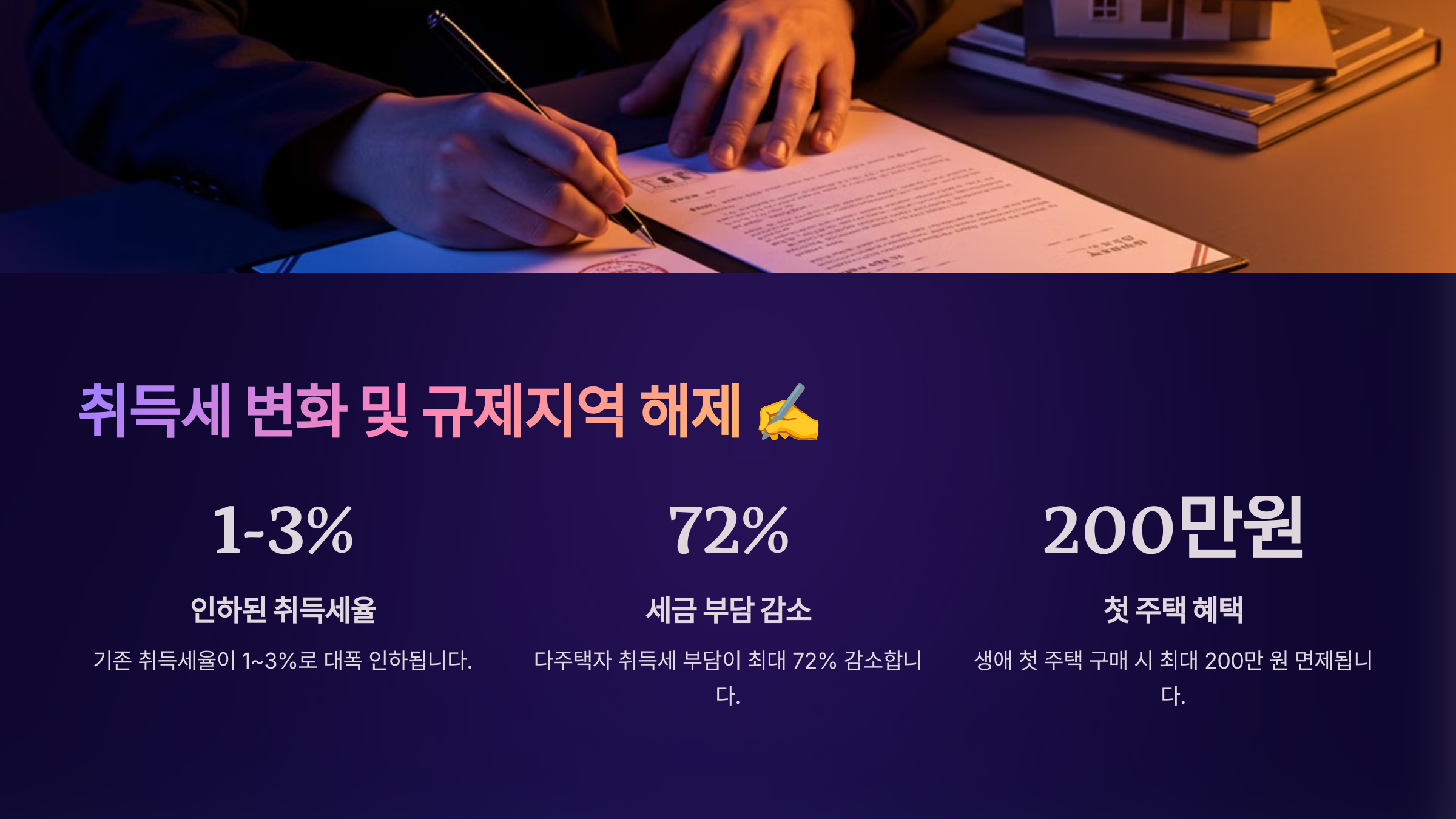 → 대부분 조정대상지역이 해제되면서, 다주택자에게 부과되던 중과세율이 사라졌어요. 예전엔 8%까지 올라가던 취득세가 기본세율(1~3%)로 적용돼요.
