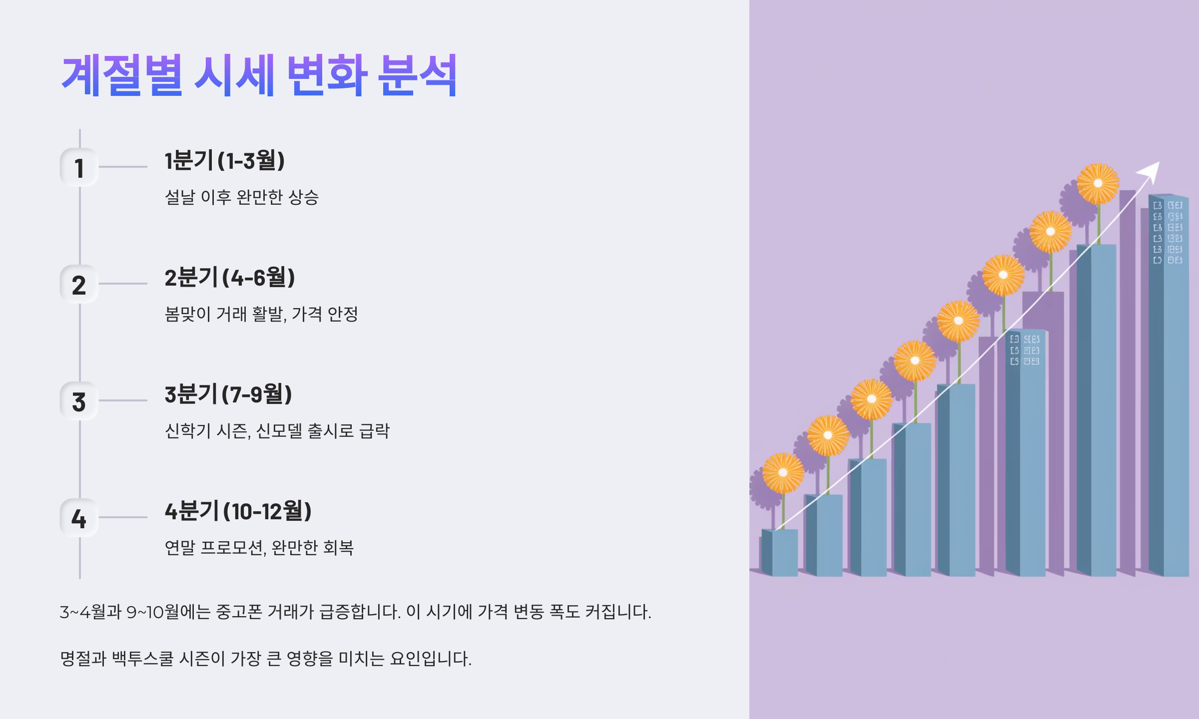 | 1~2월 | ↑ 상승 (신학기 수요) | 보급형·자급제폰 판매 적기 |