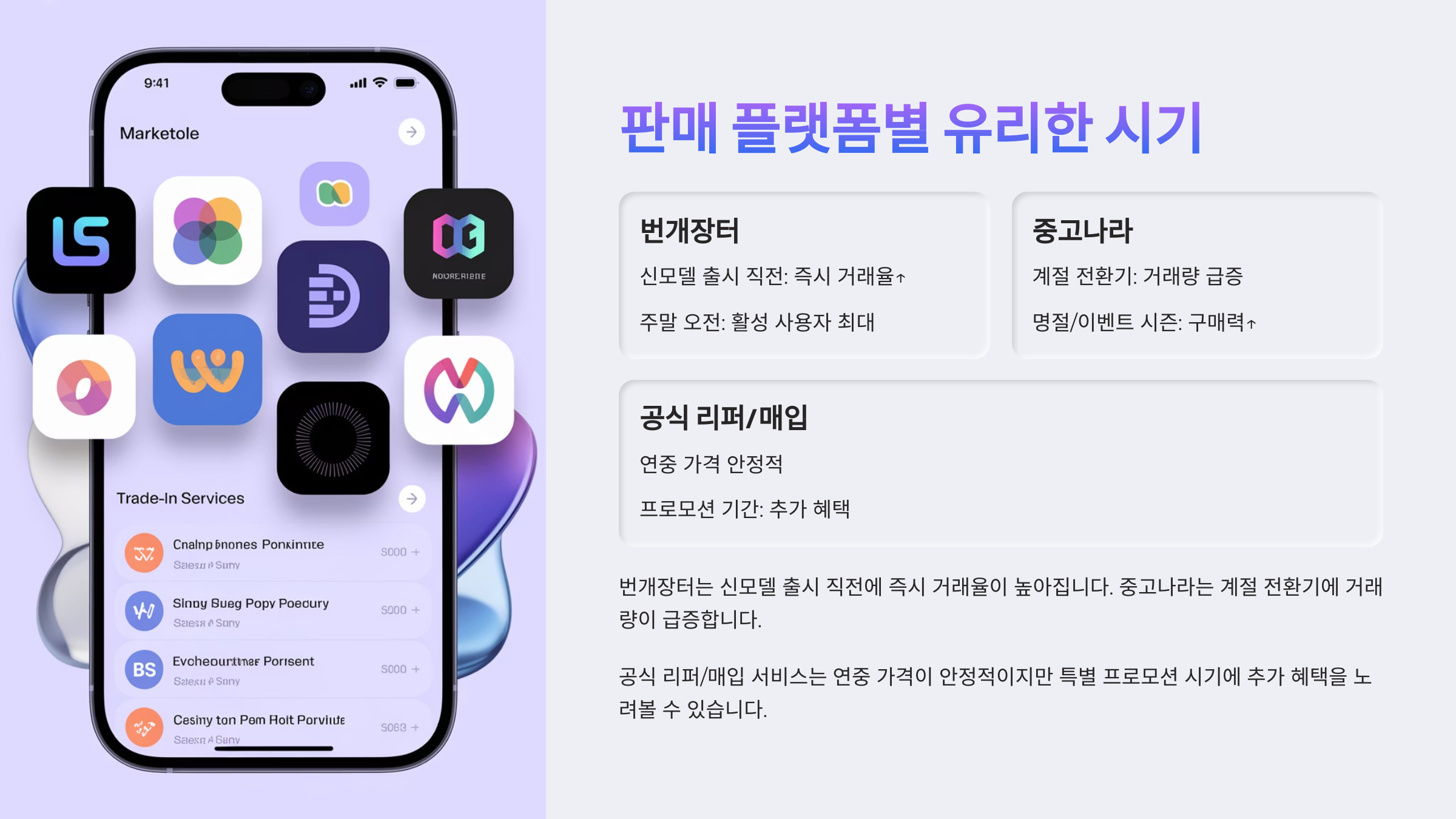 첫 번째는 타이밍 선정이에요. 앞에서 말했듯이 신제품 출시 전, 특히 발표 2~3주 전이 가장 유리한 시점이에요. 매물도 적고, 구매 수요가 살아있어 협상도 수월해요.