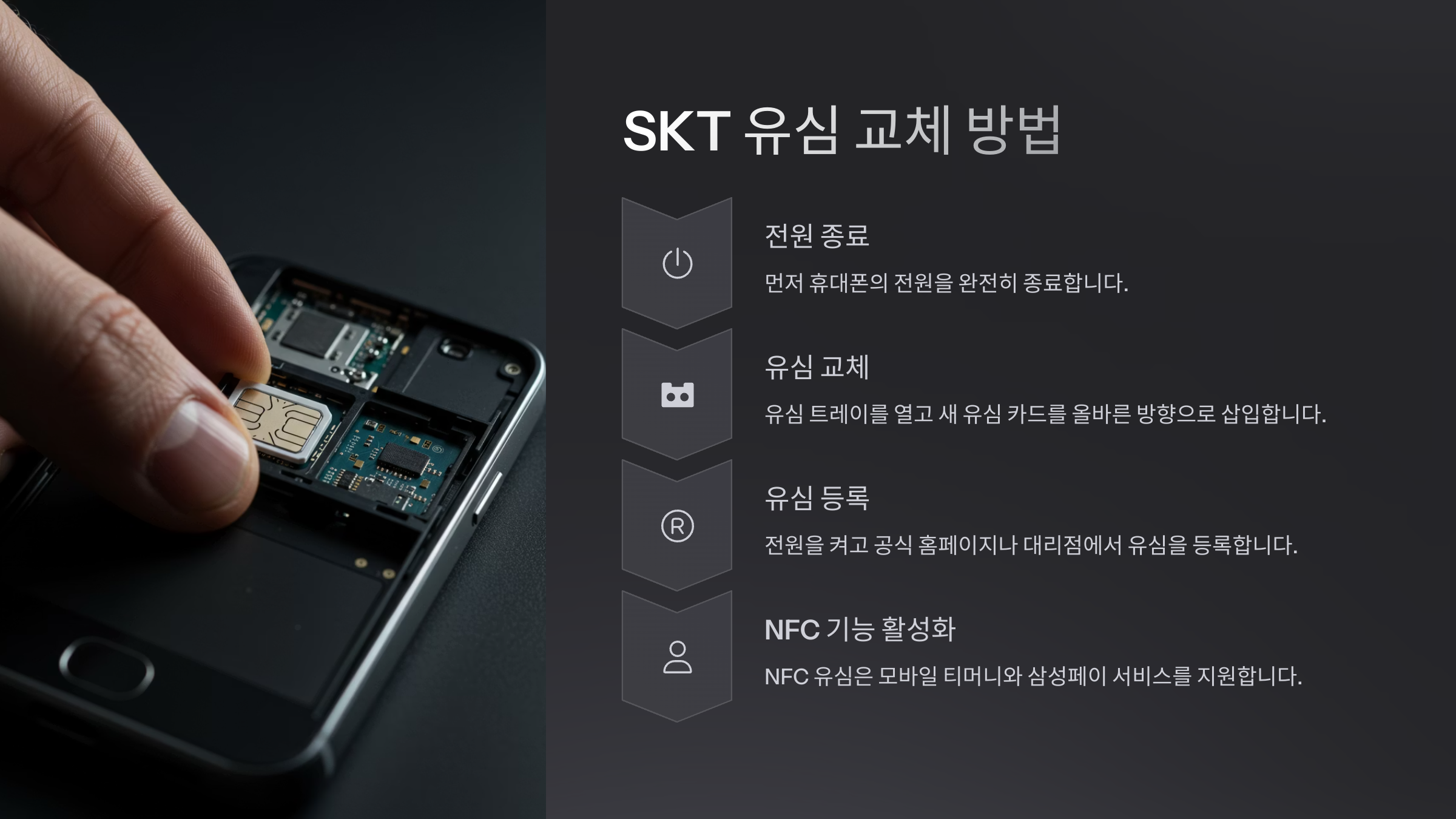 SK텔레콤은 유심 교체 절차가 가장 직관적이에요. 먼저 SKT 유심을 구입한 후, 다음과 같은 절차로 개통을 진행하면 돼요.