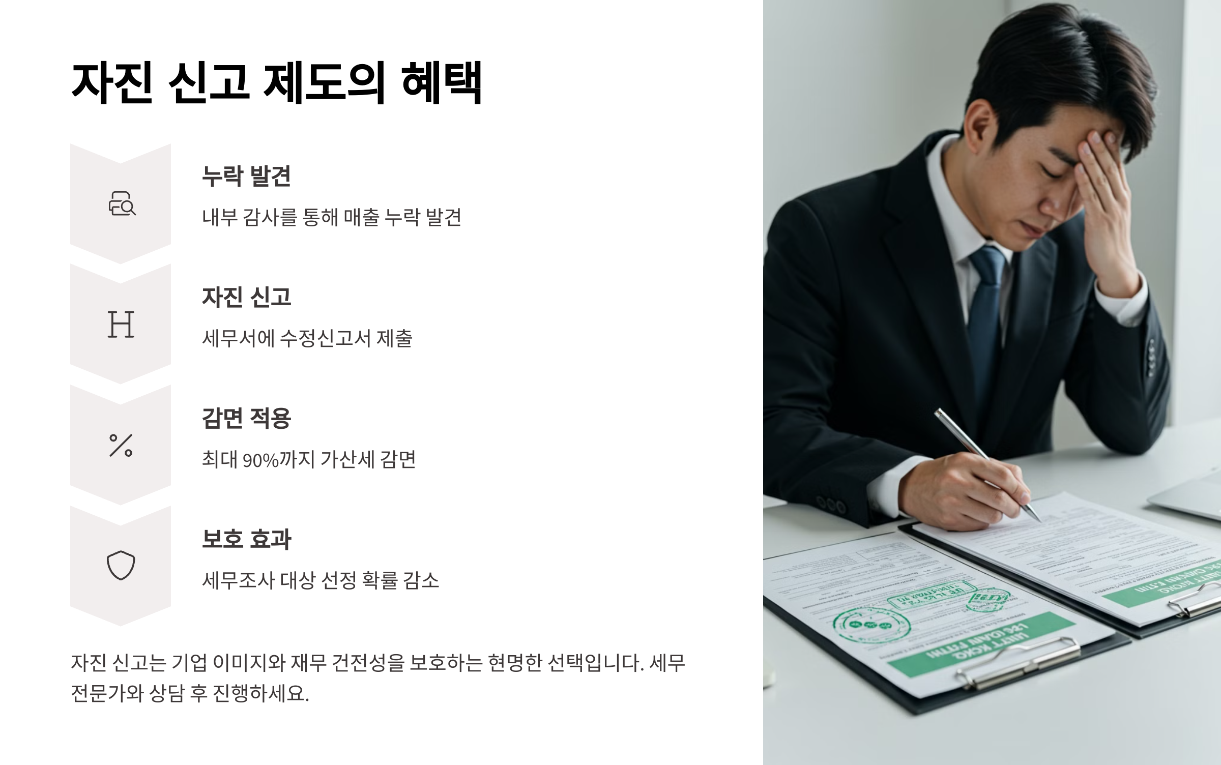 국세청은 실수로 누락된 매출을 자진해서 신고하는 사업자에게 ‘가산세 감면’이라는 혜택을 제공하고 있어요. 고의가 아닌 실수였고, 세무조사 전에 먼저 신고했다면 벌금 부담을 크게 줄일 수 있답니다.