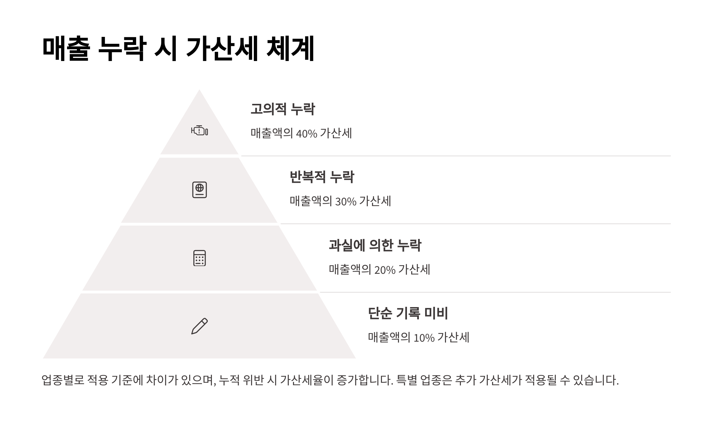 세법상 매출 누락이 확인되면 단순히 ‘추가 세금’을 내는 것에 그치지 않고, 무거운 가산세가 붙어요. 이 벌금은 누락된 매출액에 비례해 증가하고, 고의성이 있으면 더 크게 부과돼요.