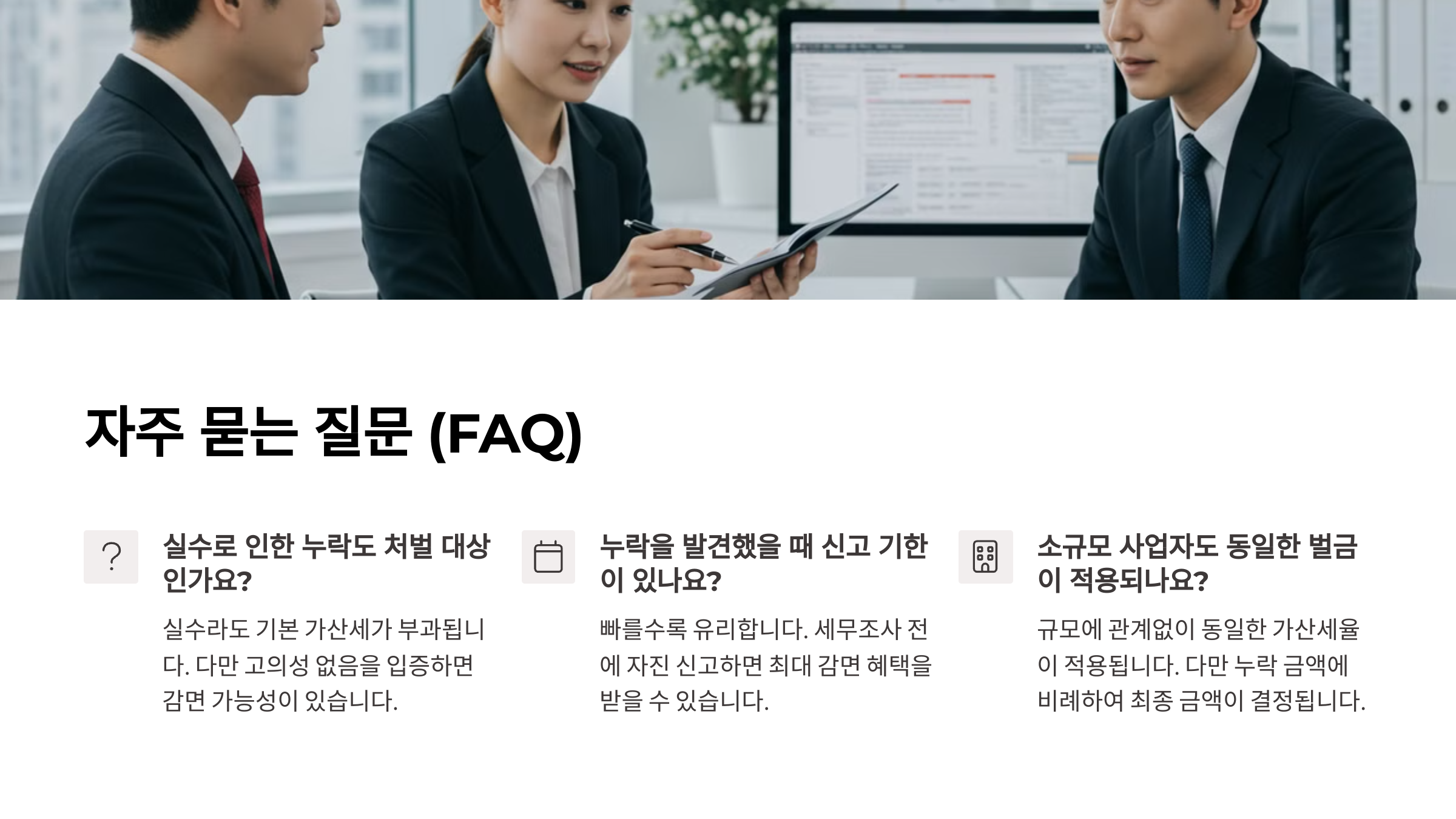 1️⃣ 무신고 – 부가세, 종합소득세, 법인세 등을 신고 기한까지 전혀 제출하지 않은 경우에 해당돼요. 납부세액의 최대 40%까지 가산세가 붙을 수 있어요.