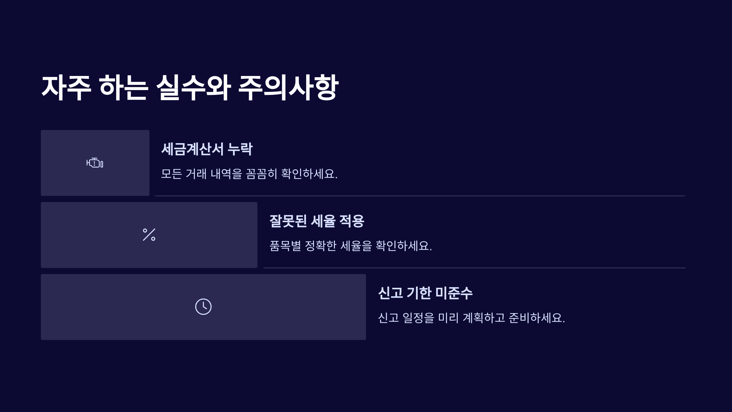 부가가치세 신고는 간단해 보이지만, 생각보다 실수하기 쉬운 부분들이 많아요. 특히 매출/매입 누락이나 잘못된 공제 처리 등은 추후에 세무조사로 이어질 수도 있어요. 미리 자주 발생하는 실수들을 알아두면 큰 도움이 돼요!