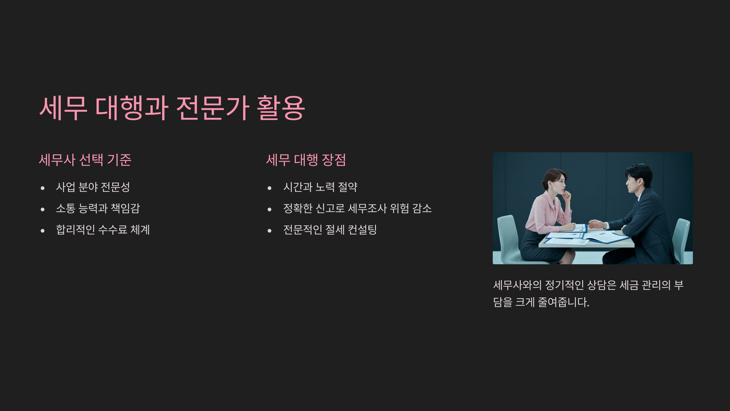 아무리 노력해도 세무와 회계가 어렵고 복잡하게 느껴진다면, 주저 말고 전문가의 도움을 받는 것도 좋은 선택이에요. 특히 일정 매출 이상이 발생하거나, 신고 항목이 복잡해지는 시점부터는 ‘세무 대행’을 고려해볼 만해요.