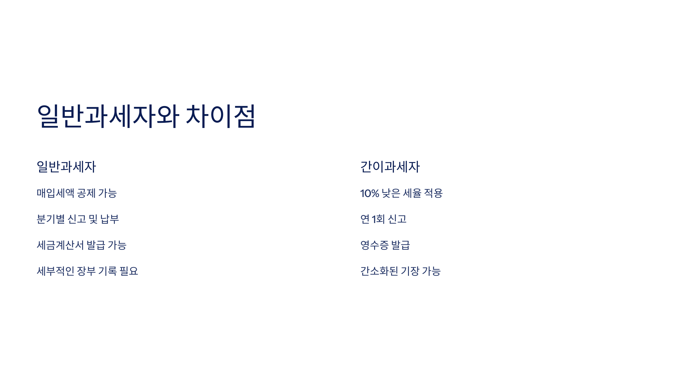 또한 일반과세자는 부가세 신고를 1년에 2번(7월, 1월) 해야 하지만, 간이과세자는 1년에 1번만 신고하면 돼요. 이 점도 바쁜 소상공인에게는 큰 장점이죠.