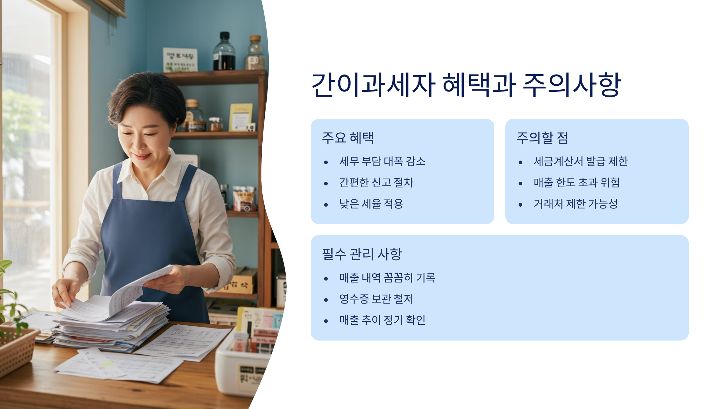 하지만 주의할 점도 있어요. 간이과세자는 거래처에서 세금계산서를 요구하는 경우, 불이익을 받을 수 있어요. 세금계산서를 자주 발급해야 하는 거래는 일반과세자가 더 유리해요.