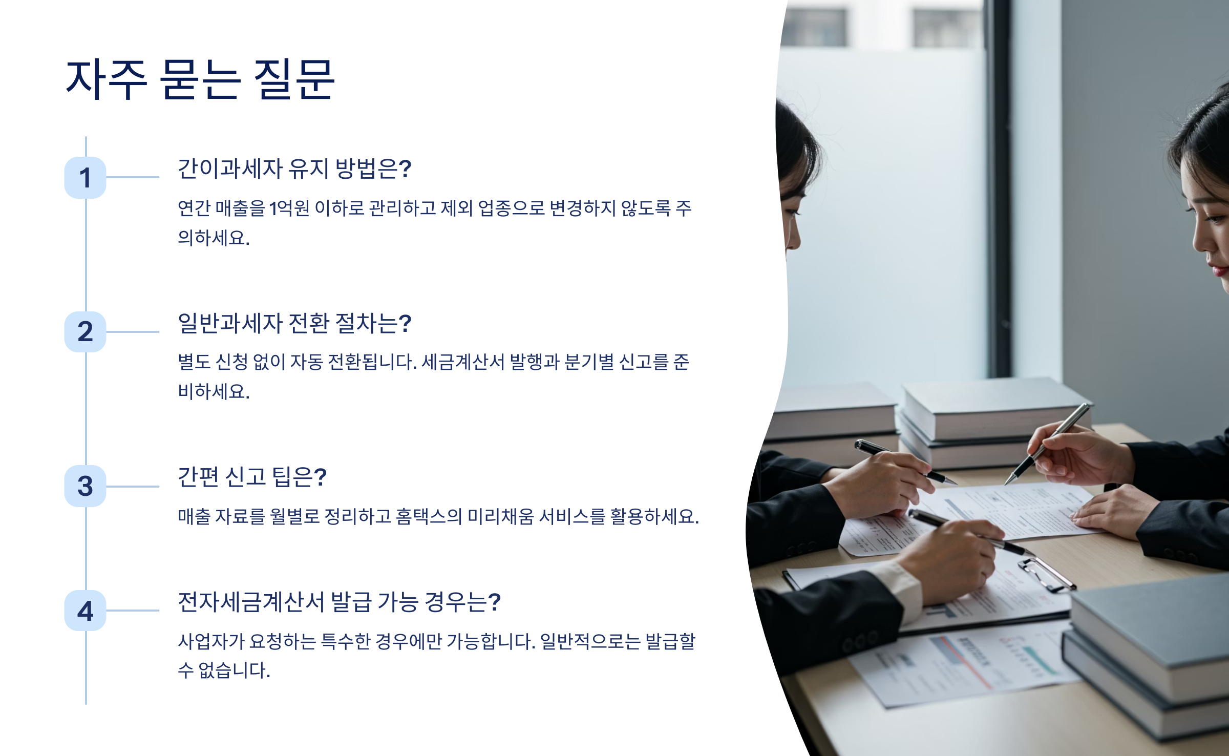 이렇게만 준비하면 간이과세자 부가세 신고, 정말 쉽게 끝낼 수 있어요. 이제 마지막으로 자주 묻는 질문들 정리해드릴게요!👇