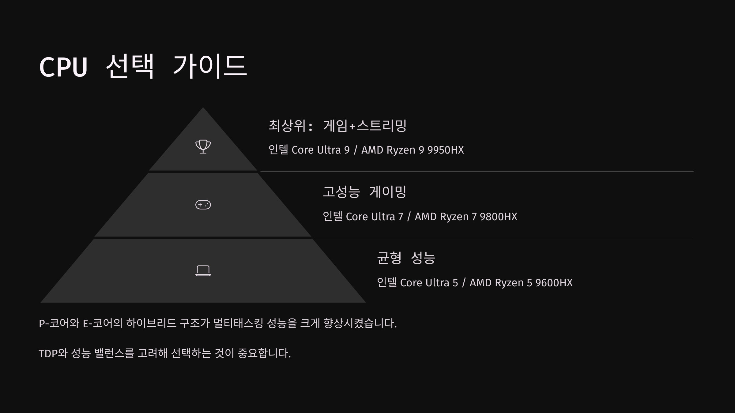 게이밍 노트북에서 CPU도 정말 중요해요. 그래픽카드만 좋아도 CPU가 받쳐주지 않으면 프레임 드랍이 발생할 수 있거든요! 🎯