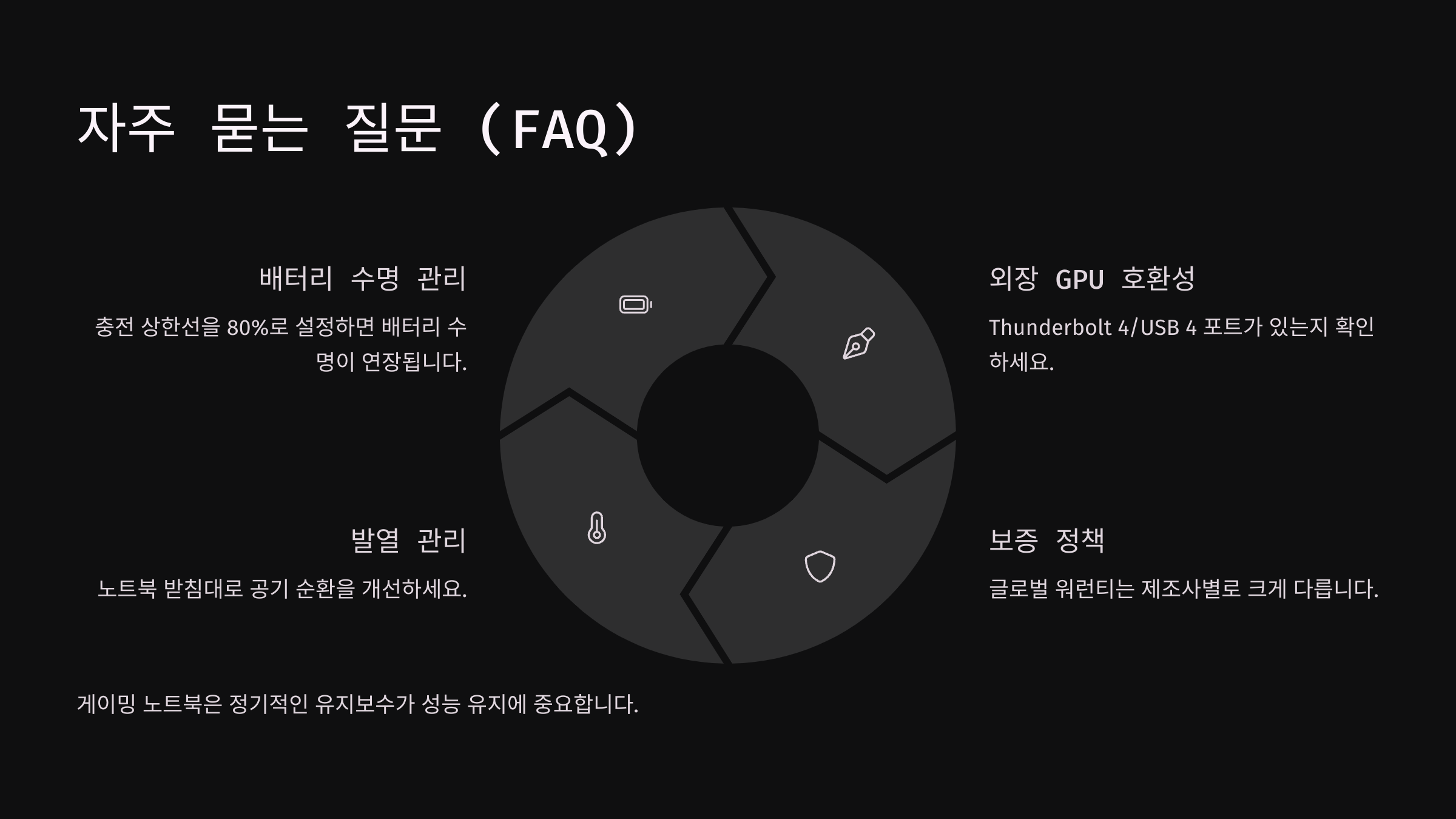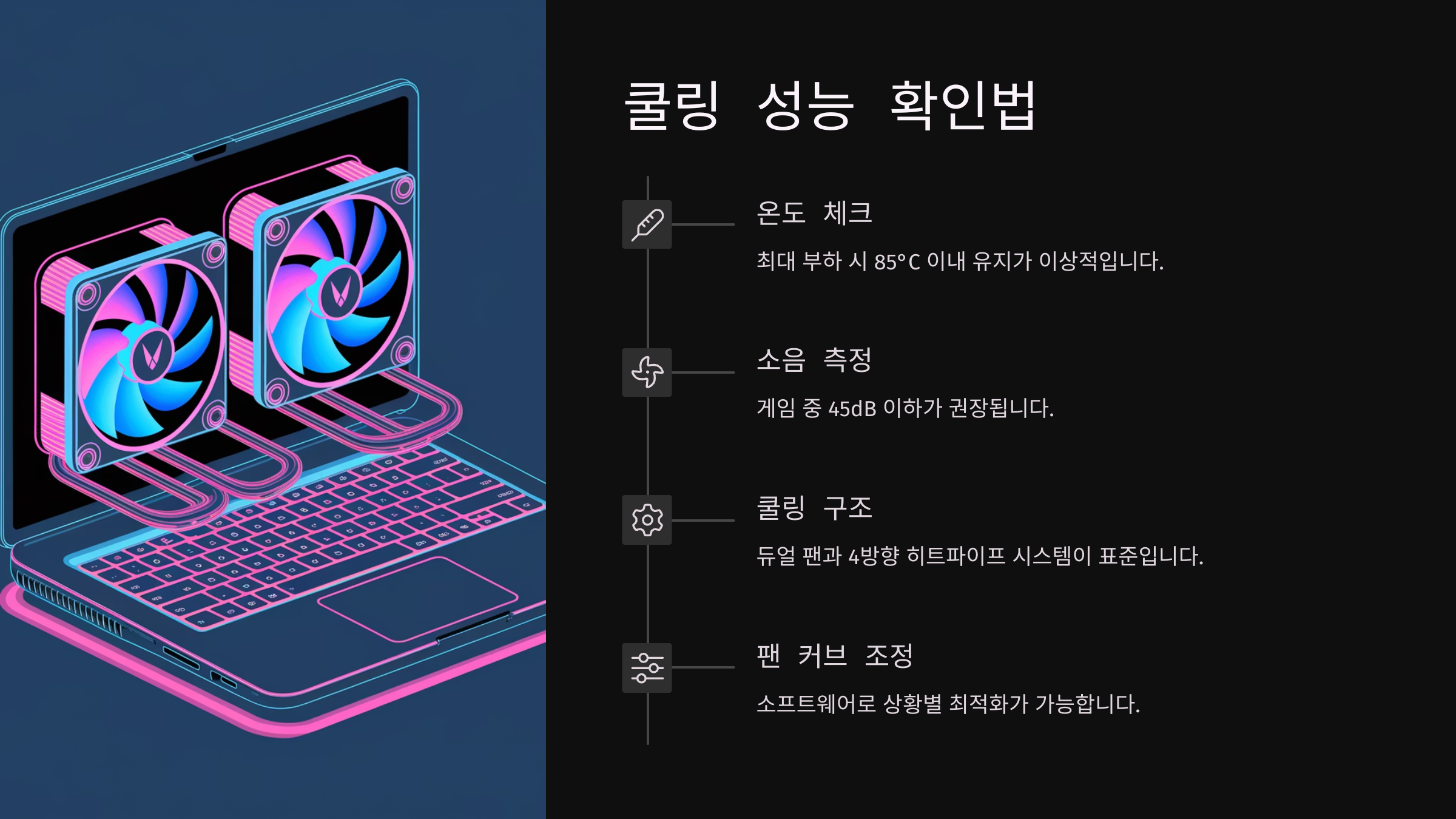 고성능 게이밍 노트북일수록 쿨링 성능이 정말 중요해요. 열 관리를 잘 못하면 성능 저하(쓰로틀링)가 생기기 때문에 쿨링 시스템 체크는 필수예요! 🔥