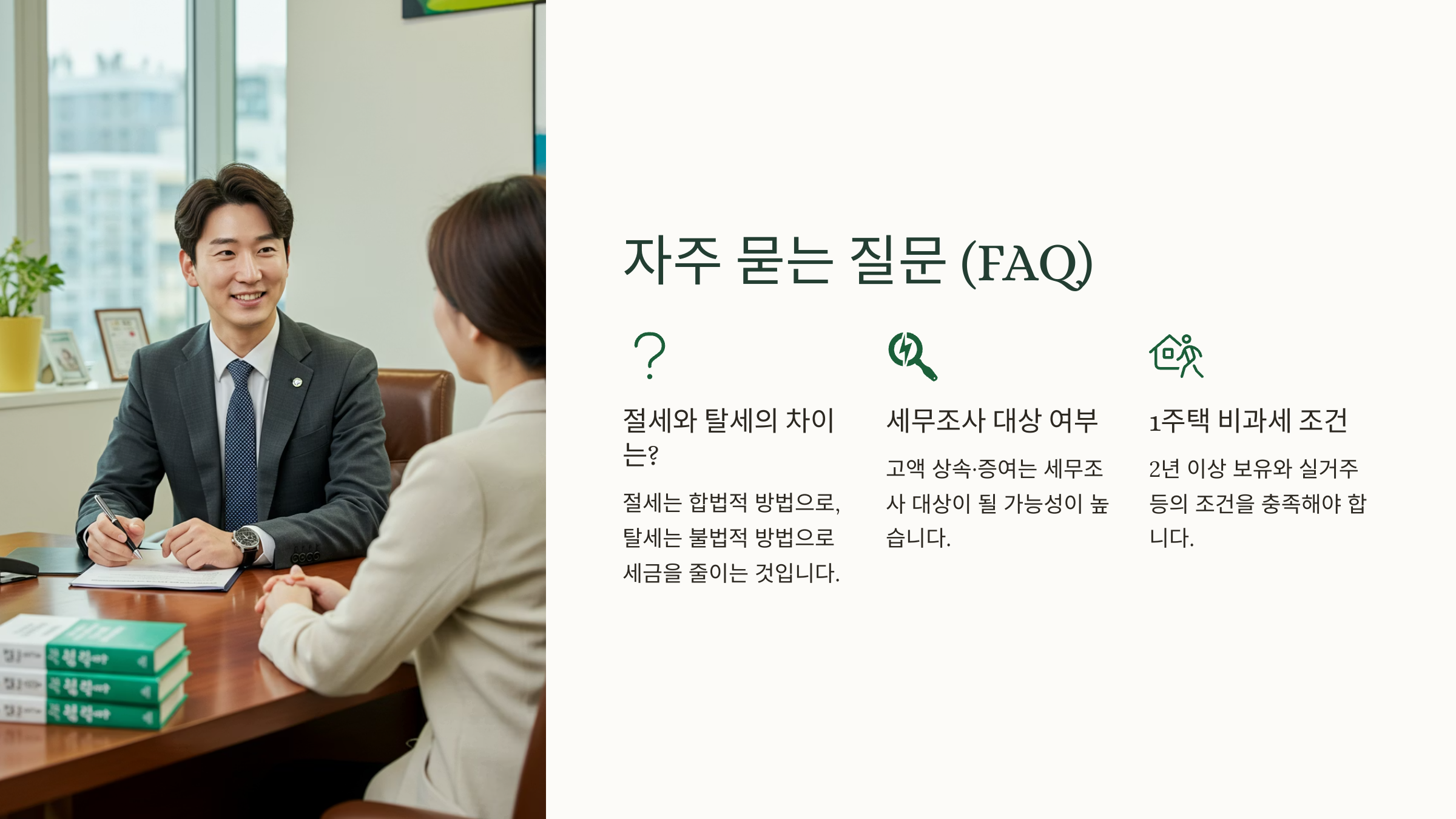 부동산은 자산이 크고 세금도 비례해서 많기 때문에, 절세 전략 하나로 수천만 원을 아낄 수도 있어요. 하지만 아무리 좋은 절세 전략이라도 잘못 적용하면 탈세가 될 수 있답니다.