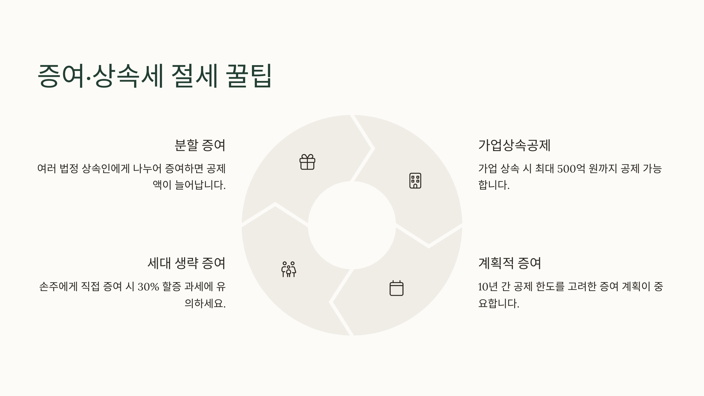 절세 전략 중 하나는 '미리 나눠서 증여하기'예요. 자녀가 어릴 때부터 10년 단위로 나눠서 증여하면 누적 공제를 충분히 활용할 수 있어요. 예를 들어 10살, 20살, 30살 때 세 번에 걸쳐 증여하면 공제를 세 번이나 받을 수 있죠.