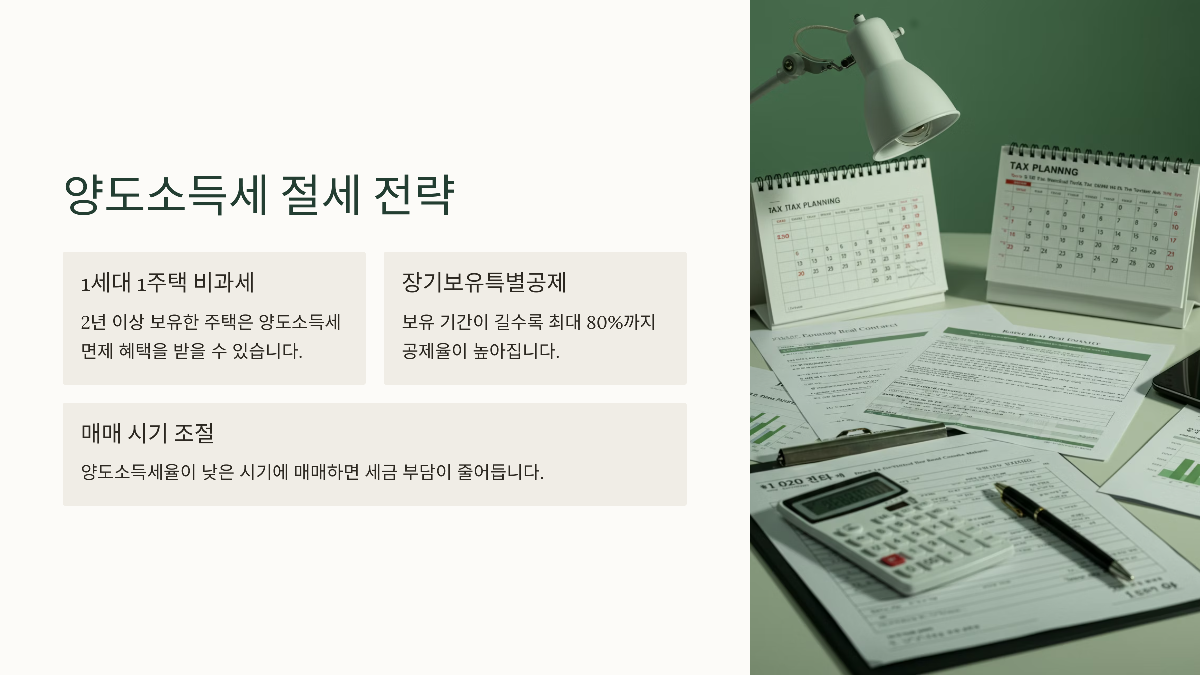 양도세는 장기보유특별공제를 잘 활용해야 해요. 일정기간 이상 보유하면 보유 기간에 따라 양도차익에서 일정 비율을 공제해줘요. 예를 들어 10년 이상 보유했다면 최대 40%까지 공제받을 수 있답니다.