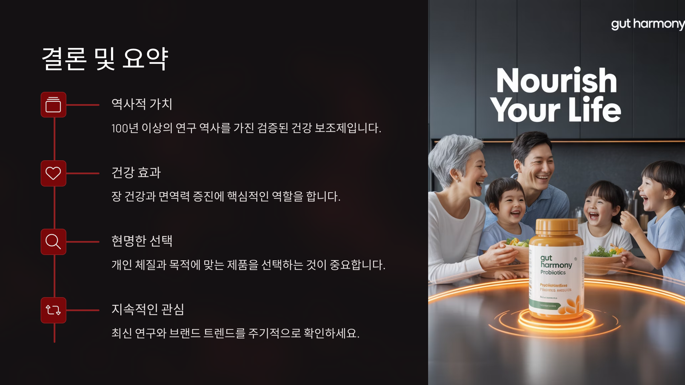 마지막으로, 유산균은 건강기능식품이지만 모든 질병에 대체되는 건 아니에요. 특정 질환 치료 목적이라면 의료 전문가와 상담 후 맞춤형 유산균을 섭취하는 게 가장 좋아요. 👍