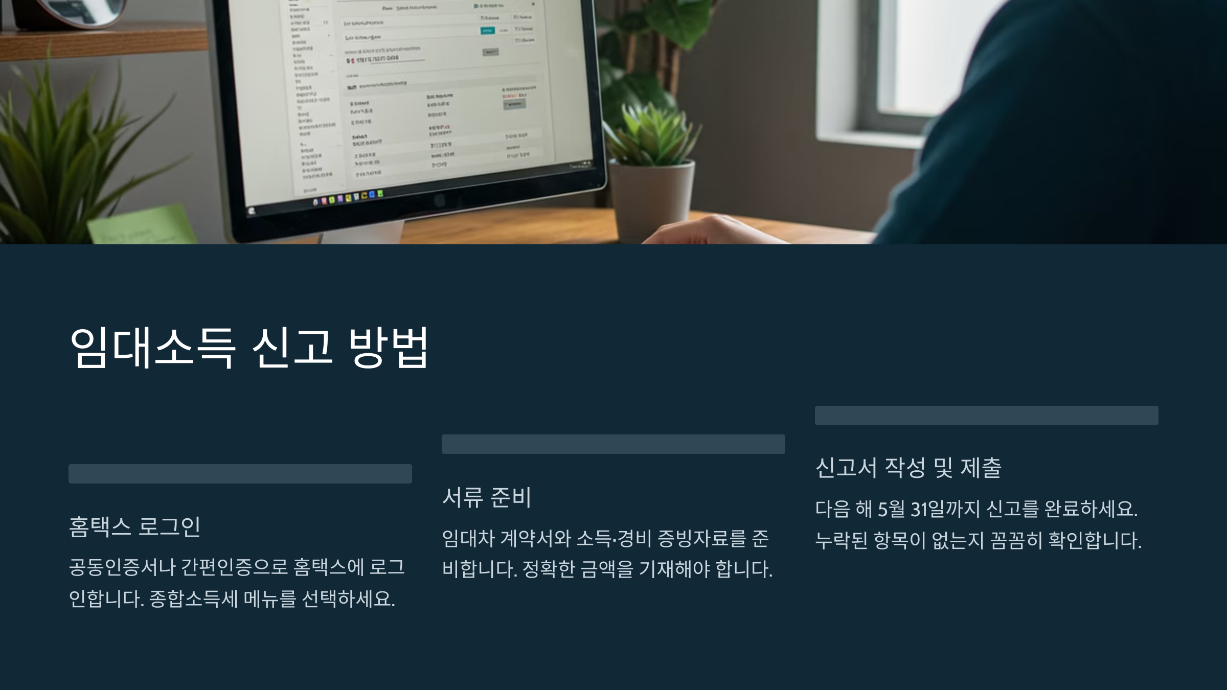 신고는 아래와 같은 절차로 진행돼요: 1. 홈택스 접속 → 로그인 2. ‘종합소득세 신고’ 클릭 3. '임대소득 항목' 선택 4. 임대료, 주소지, 보증금 등 정보 입력 5. 경비 및 공제 항목 입력 6. 세액 확인 및 신고서 제출 굉장히 직관적으로 구성돼 있어서 따라가기 어렵지 않아요.