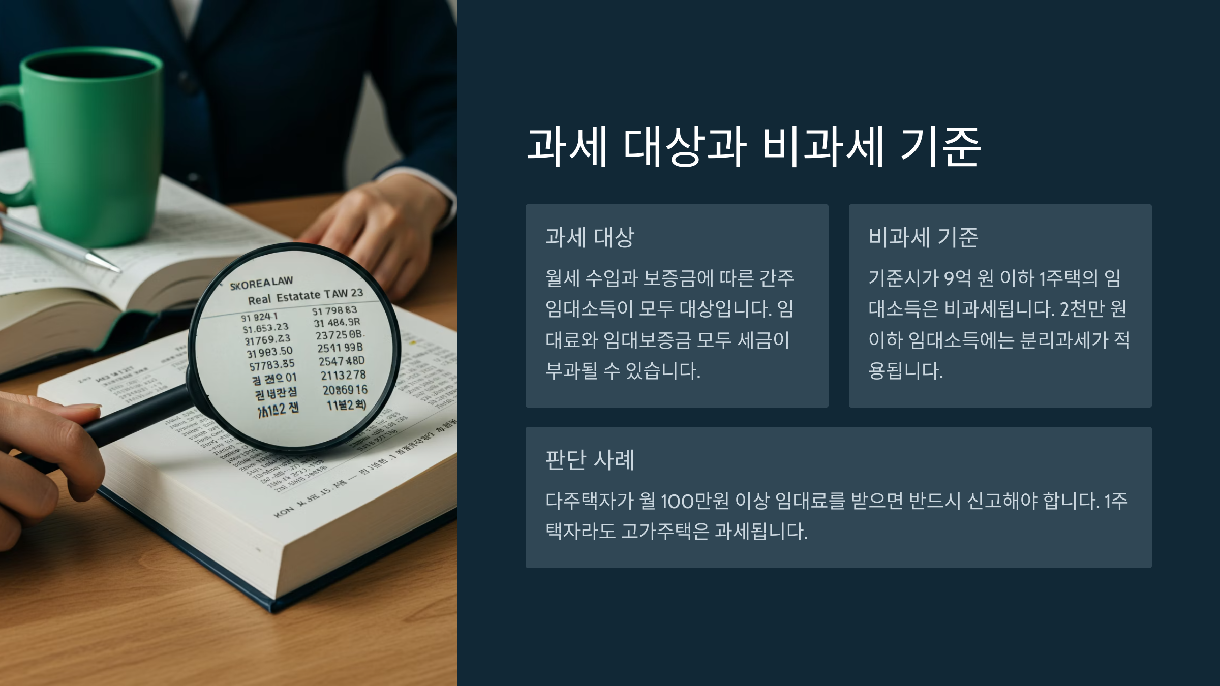 임대소득이 모두 과세 대상이 되는 건 아니에요. 일정 기준 이하일 경우에는 비과세 또는 분리과세 혜택을 받을 수 있답니다. 기준을 정확히 이해해야 누락 없이 신고할 수 있어요.