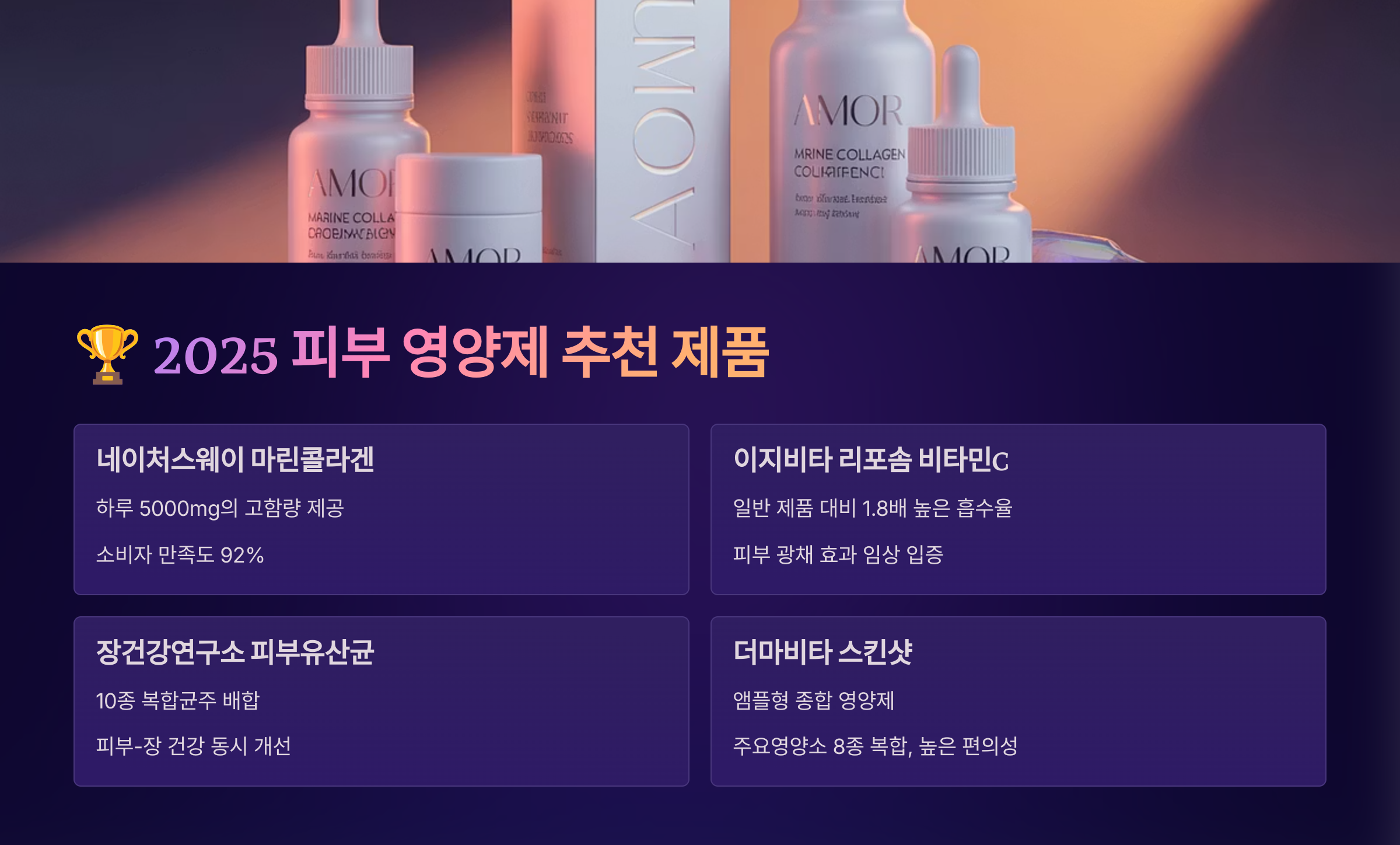 이처럼 피부 영양제는 단순히 ‘피부에 좋다’는 것만 보고 고르면 안 되고, 자신의 트러블 원인, 섭취 성향, 기능성 여부 등을 종합적으로 고려해 선택해야 해요. 다음 섹션에서는 이런 기준을 바탕으로 2025년 기준 추천할 만한 피부 트러블 영양제를 소개할게요.