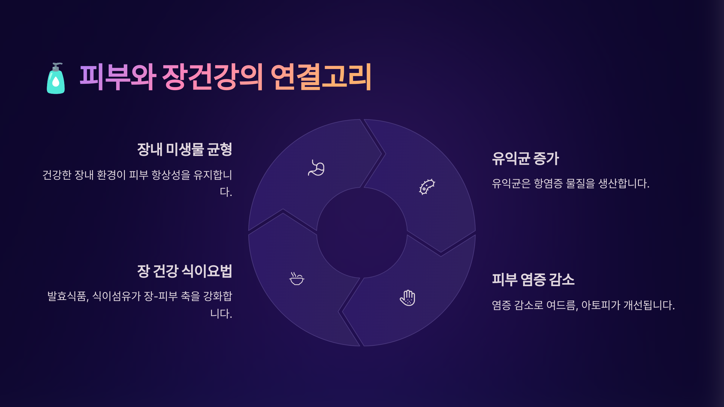 추천 제품은 자신의 피부 타입과 트러블 원인에 따라 선택하는 것이 중요해요. 염증성 여드름에는 항염 성분이, 건조하고 예민한 피부에는 보습과 항산화 성분 위주로 고르면 좋아요. 다음 섹션에서는 피부와 장건강의 연결 관계에 대해 더 알아볼게요.