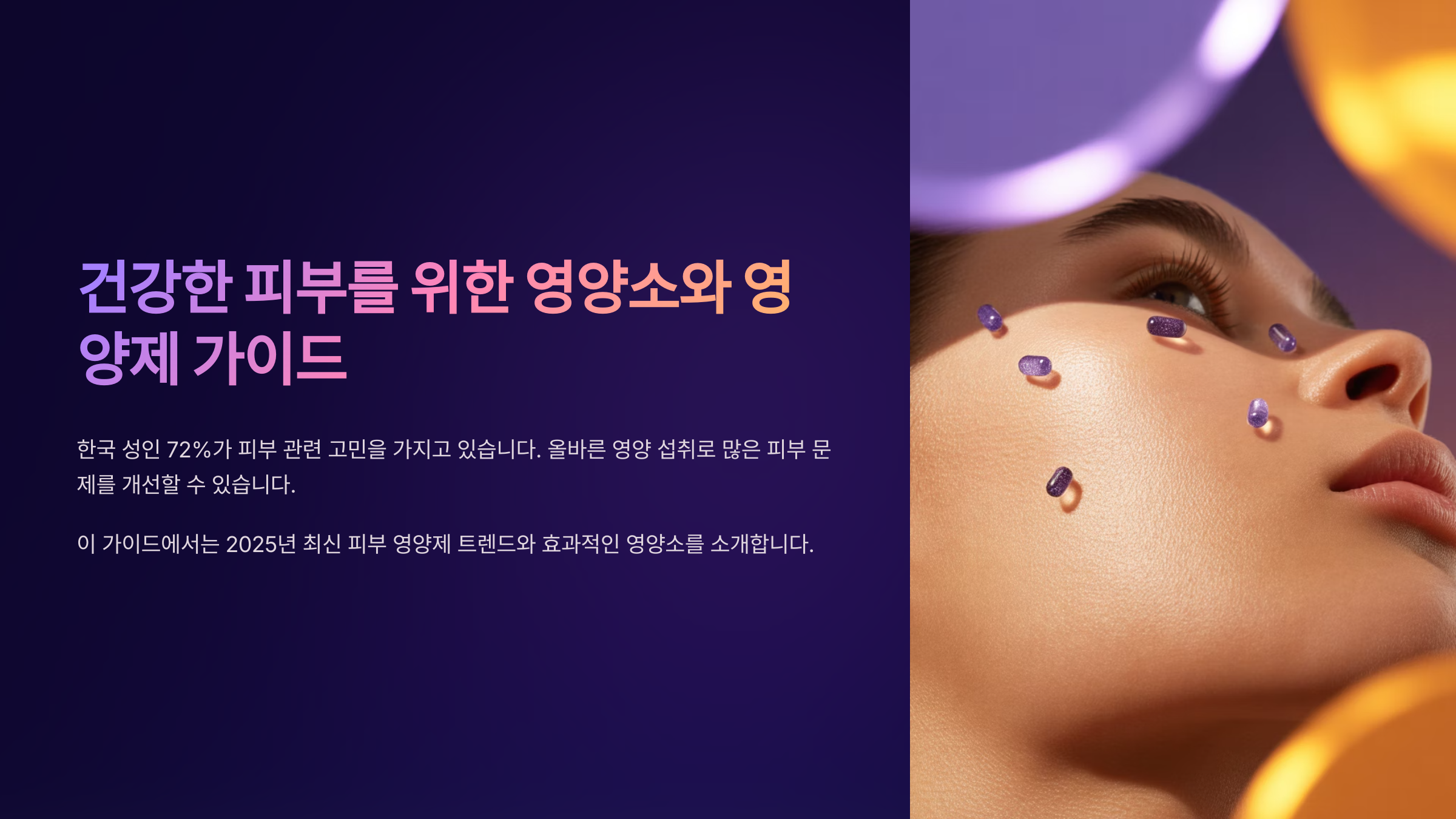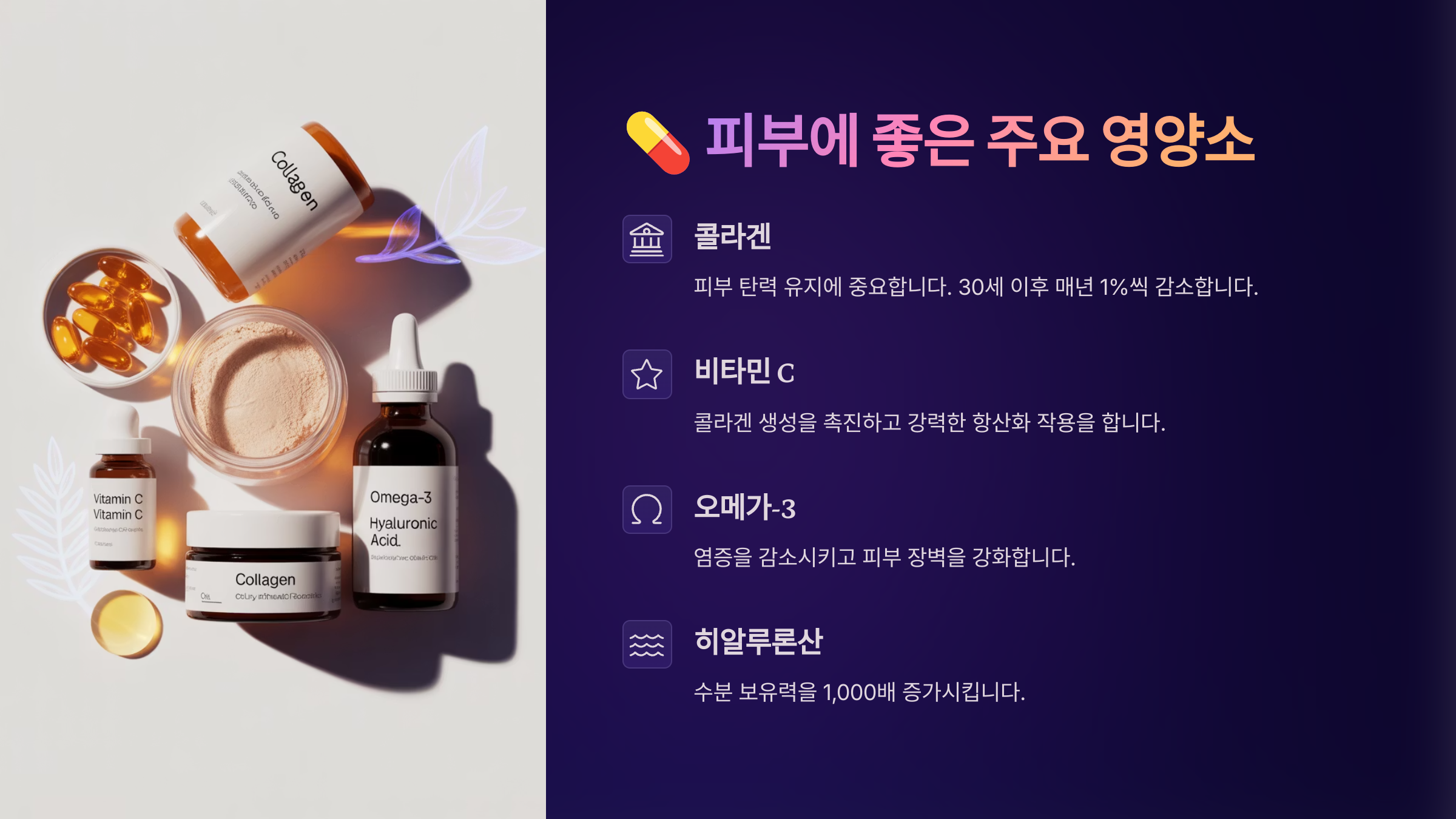이처럼 피부 트러블은 단순히 겉에서 생기는 문제가 아니라, 우리 몸속 다양한 기능과 깊은 연관이 있어요. 그래서 트러블이 잦다면 겉만이 아닌 속부터 살펴봐야 해요. 이제 다음 섹션에서는 피부에 직접적으로 좋은 영양소들을 소개해볼게요.