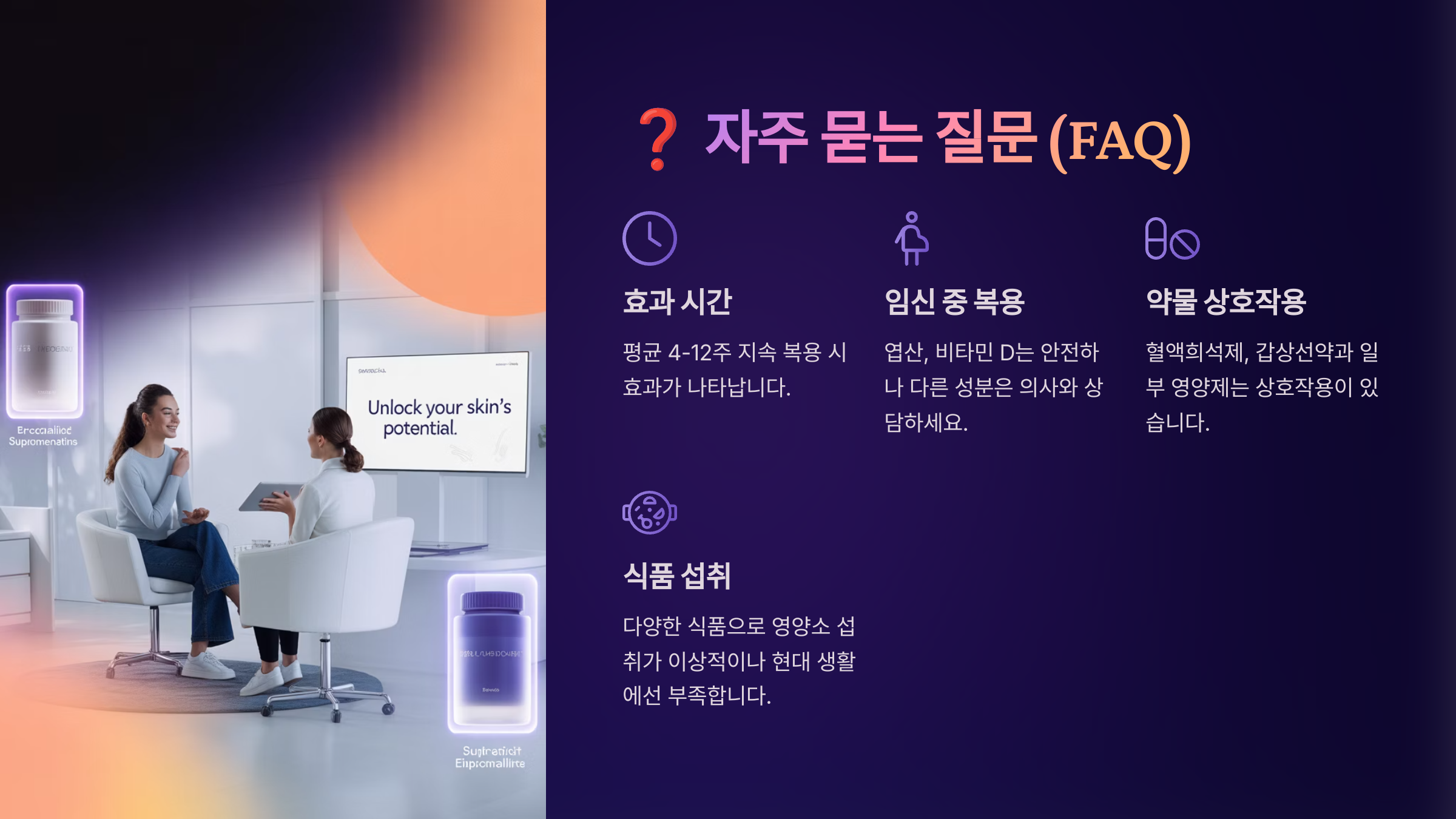이제 피부 트러블을 개선하기 위한 영양제 복용법까지 알게 되었으니, 본격적으로 나에게 맞는 루틴을 시작해보면 좋겠죠? 마지막으로 많은 분들이 궁금해하는 질문을 정리한 FAQ로 마무리할게요!
