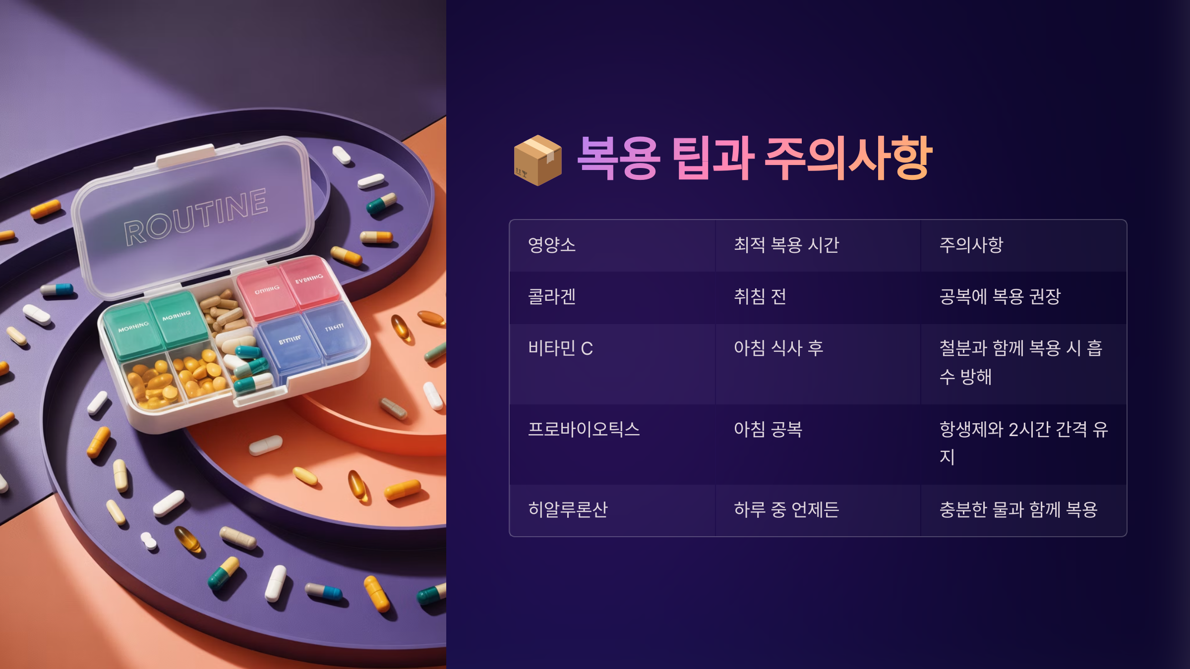 다음 섹션에서는 이런 영양제와 유산균을 보다 효과적으로 복용하는 방법과 주의사항을 안내해드릴게요. 잘못된 복용은 효과를 떨어뜨릴 수 있으니 꼭 체크해보세요!