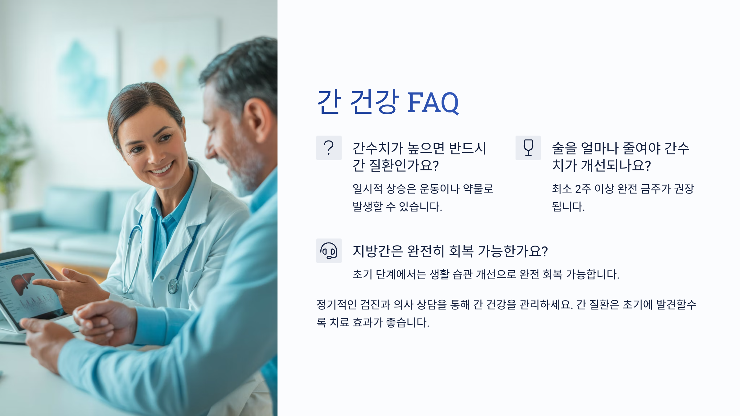 A1. 간은 서서히 회복되는 장기예요. 수치가 내려가는 데 최소 1~3개월은 걸리고, 지속적인 생활습관 관리가 핵심이에요.
