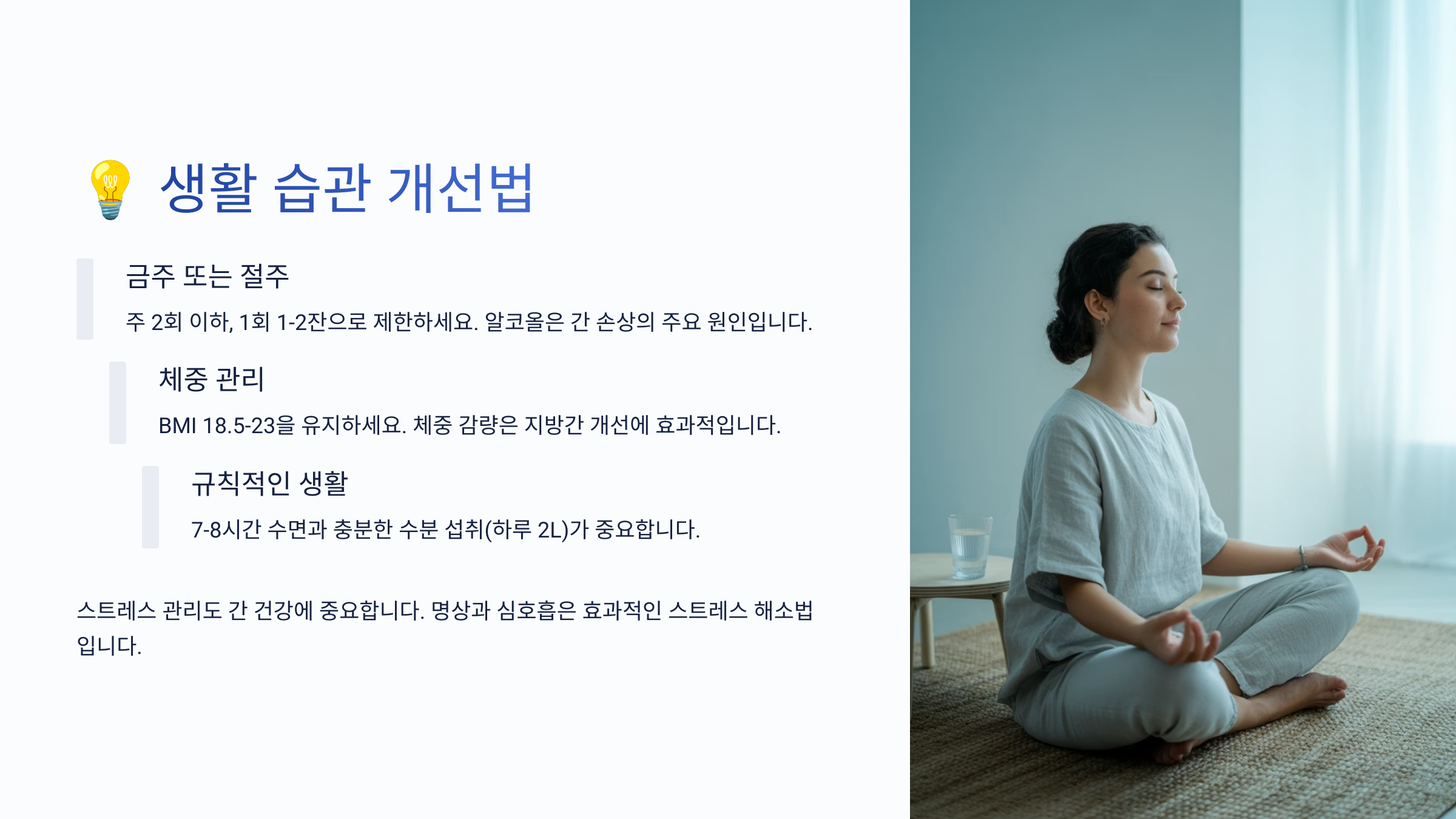 또한 ‘음주 습관 점검’도 필수예요. 주 2회 이상 음주가 있거나, 한 번에 마시는 양이 많다면 간세포가 손상될 가능성이 커요. 금주가 어렵다면 최소한 주 5일 이상은 간을 쉬게 해줘야 해요.