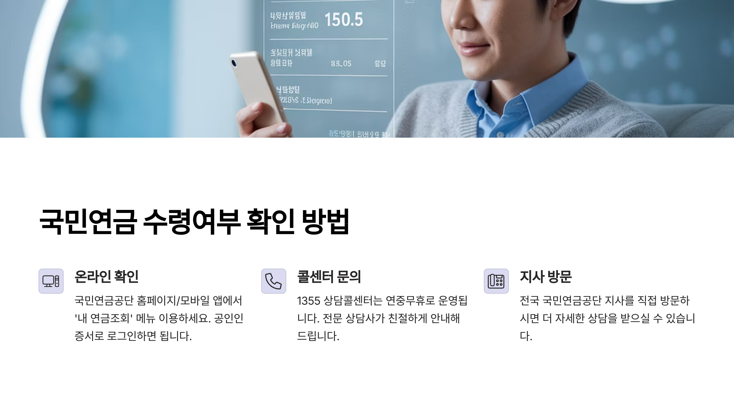 모바일 앱 ‘내 곁에 국민연금’에서도 동일하게 조회 가능하고, 콜센터(1355)를 통해서도 문의할 수 있어요. 어르신들이 쉽게 접근할 수 있도록 전화 서비스도 잘 돼 있답니다.