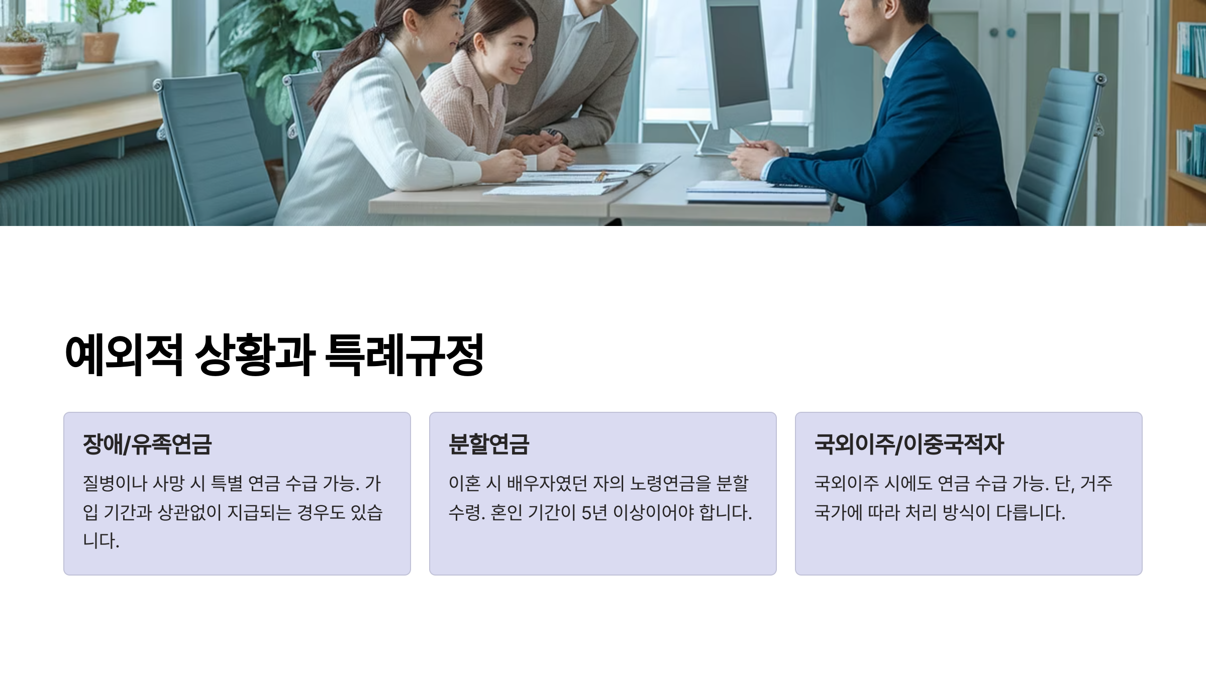 국민연금 제도에는 일반 규정 외에도 몇 가지 특례 조항이 있어요. 특히 장애인, 유족, 외국인, 군 복무자 등 특정 조건을 충족하는 경우에는 일반적인 조건과 달리 적용돼요.