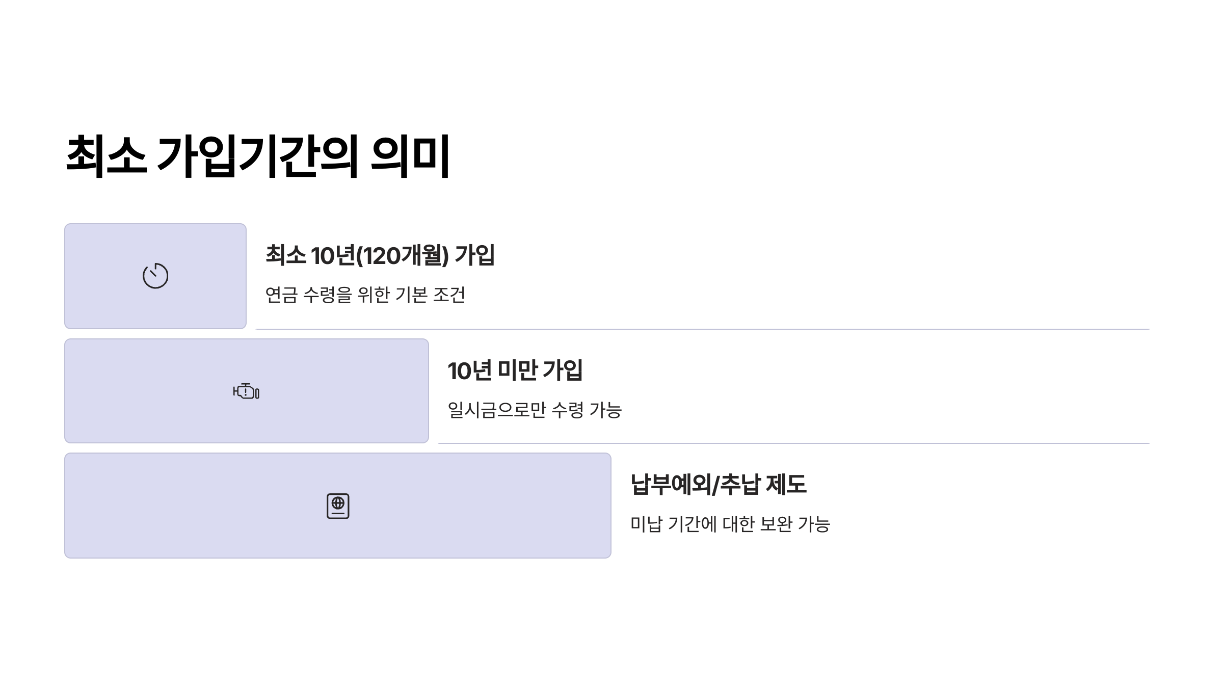 가입 기간 부족, 수령 개시 나이, 추후 납부 여부 등 내가 받을 수 있는 조건인지 3분만 투자하면 다 알 수 있어요. 지금 바로 확인해보는 걸 추천해요!