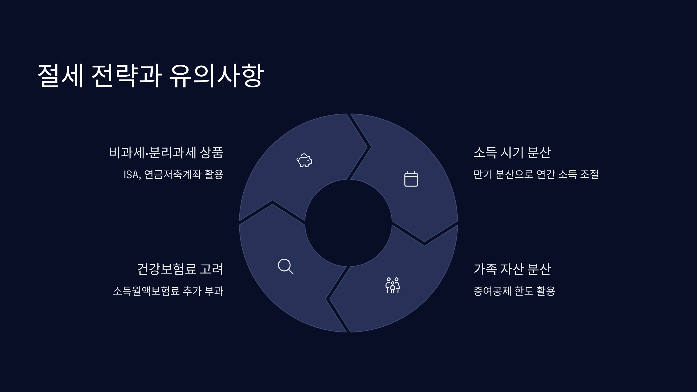 | 세제 상품 활용 | ISA, 연금저축, IRP | 과세 이연 또는 면제 |