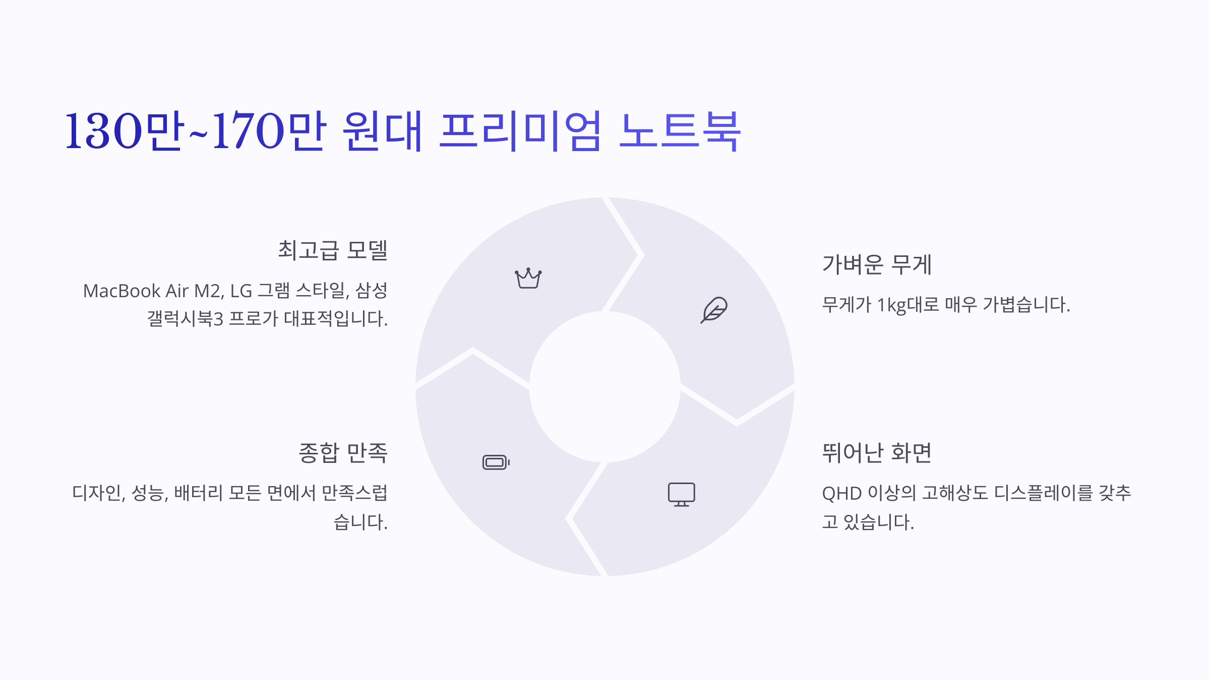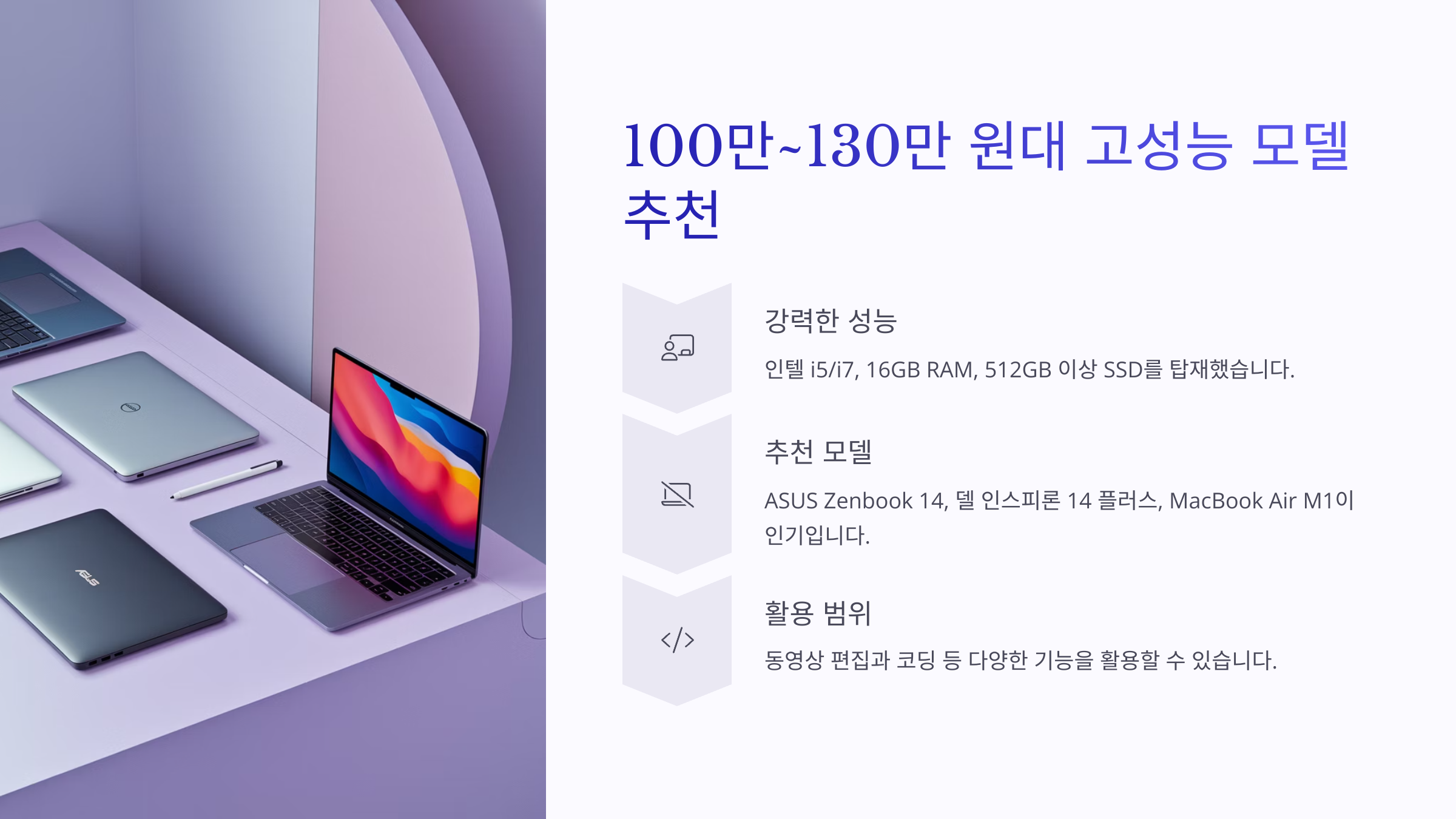 100만 원~130만 원대 예산이면 퍼포먼스와 디스플레이 퀄리티 모두 '확실하게' 만족할 수 있는 노트북을 선택할 수 있어요! 🎯