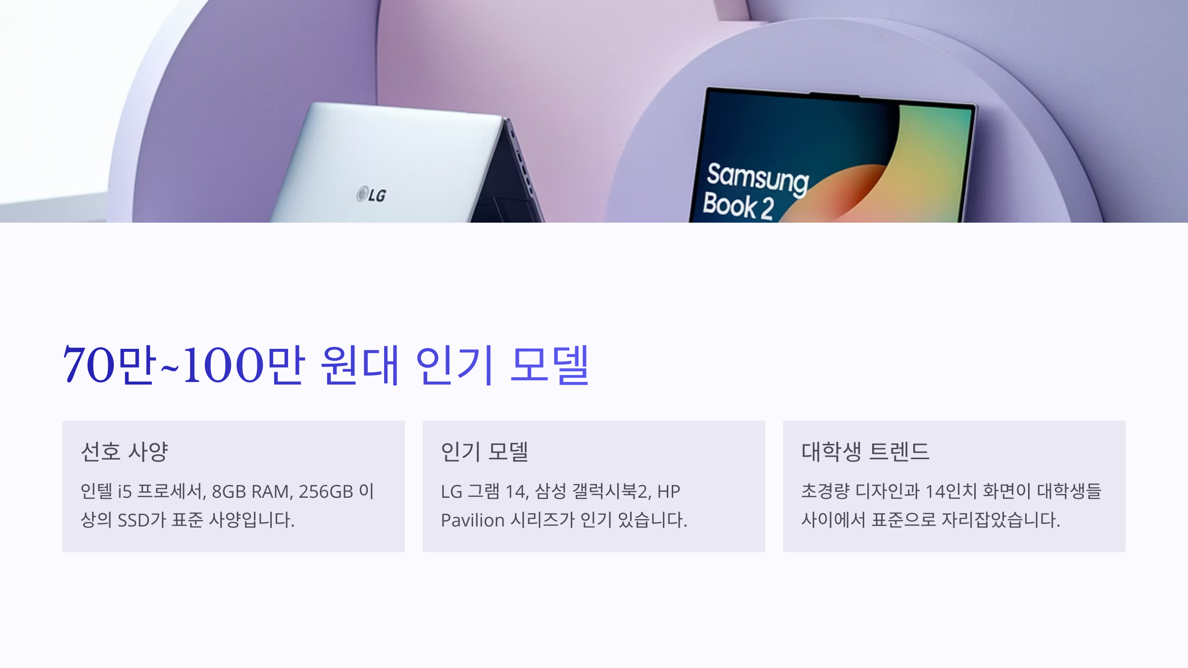 70만 원대에서 100만 원대 사이 노트북은 '진짜 대학생 필수 스펙'을 제대로 갖춘 제품이 많아요! 📚